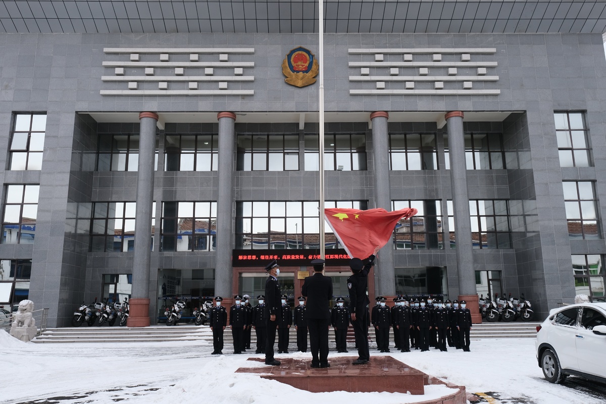 红原县是阿坝州海拔最高县城,上午8时30分,天上开始飘着雪。2022年的第一个清晨格外地寒冷,但全体公安干警们不畏严寒,精神抖擞地整齐列队。伴随着现场指挥员清脆洪亮的口令,三名国旗手护卫着五星红旗,迈着铿锵有力的步伐走向国旗台。