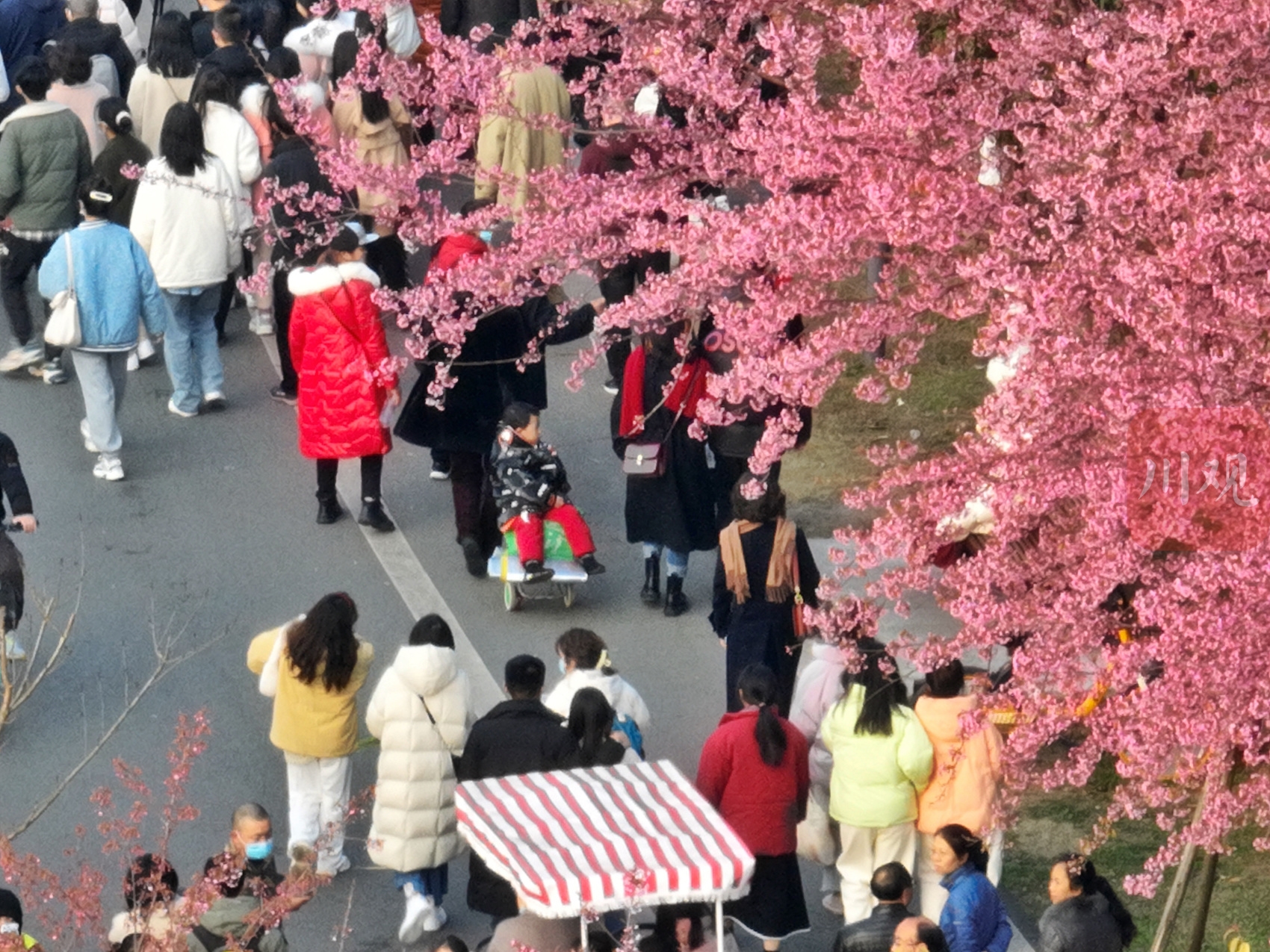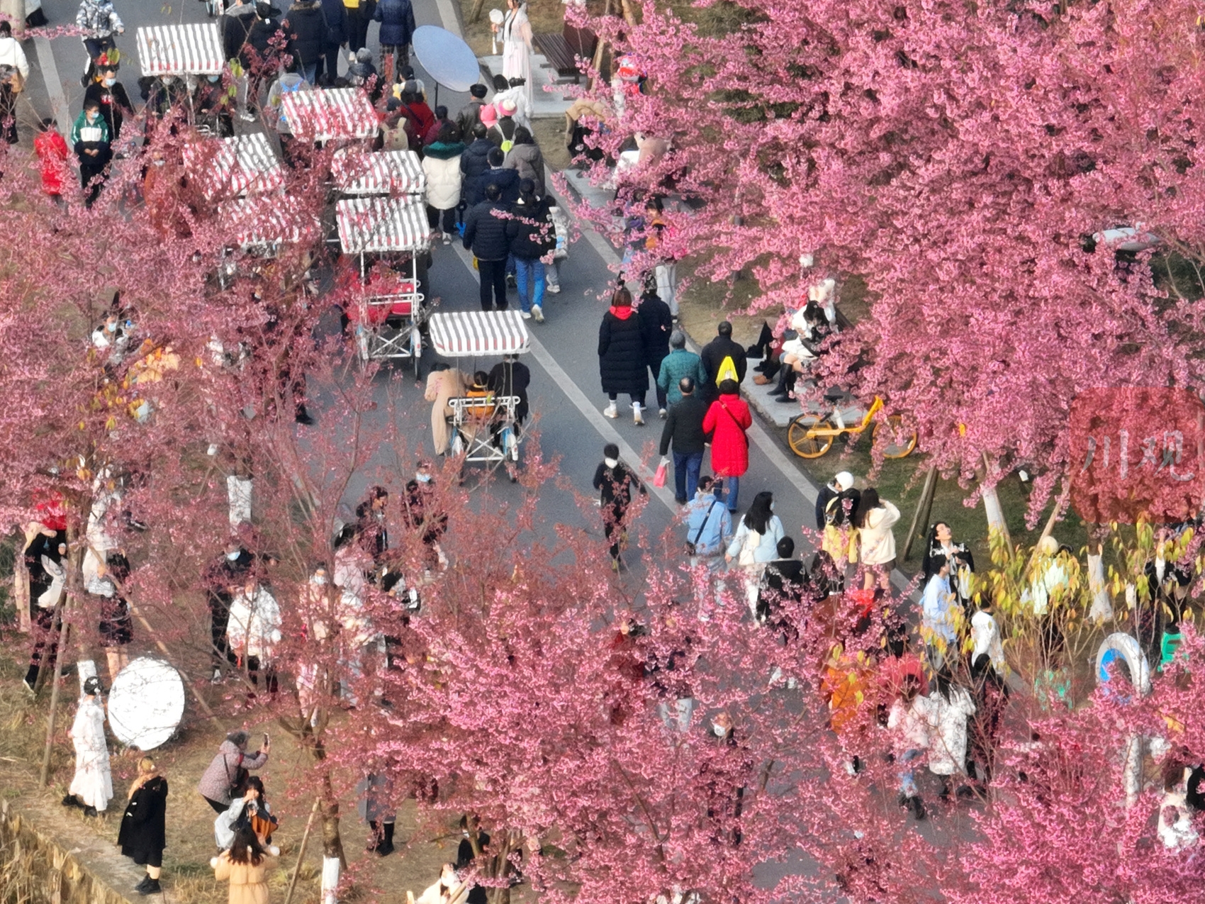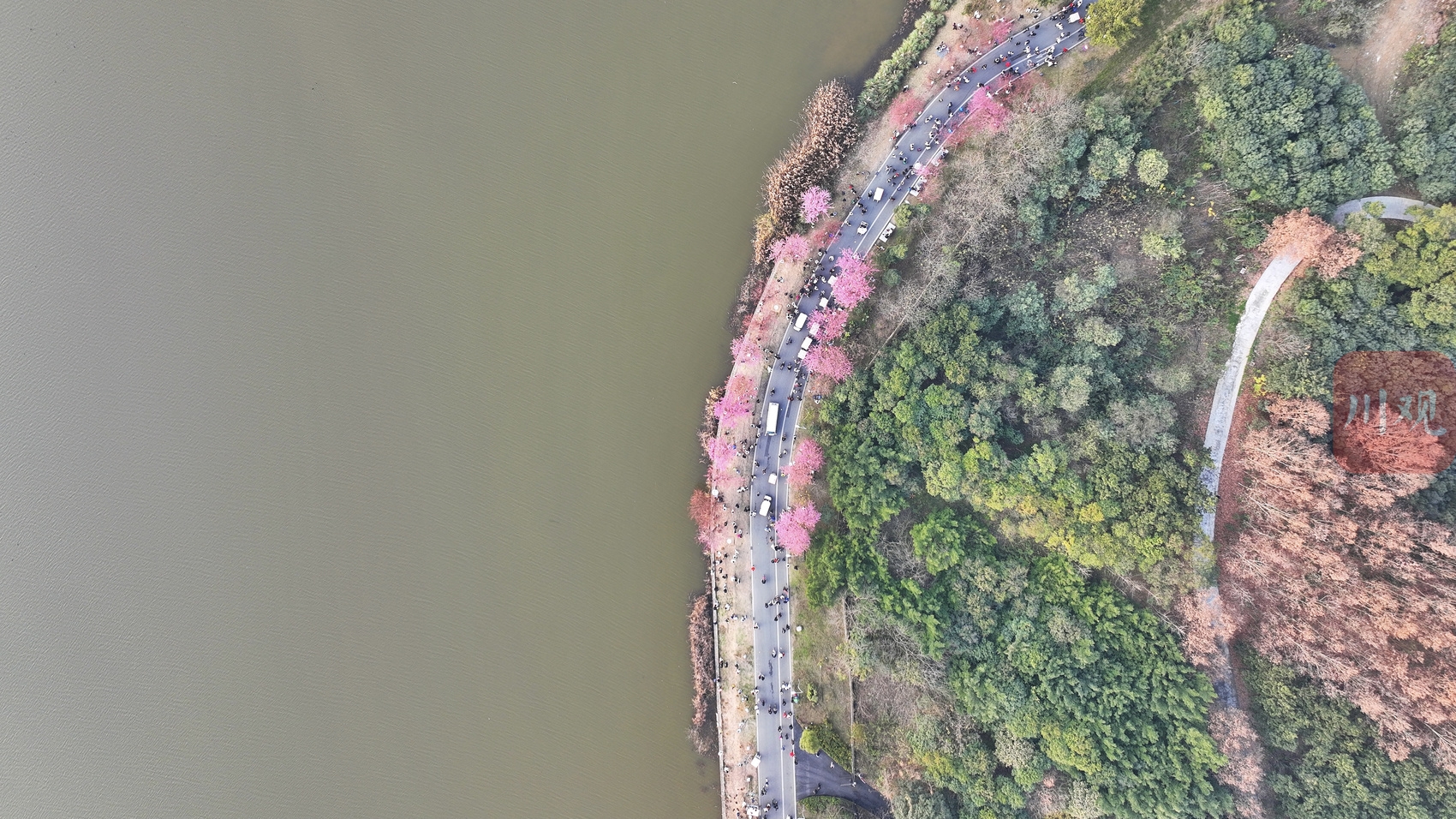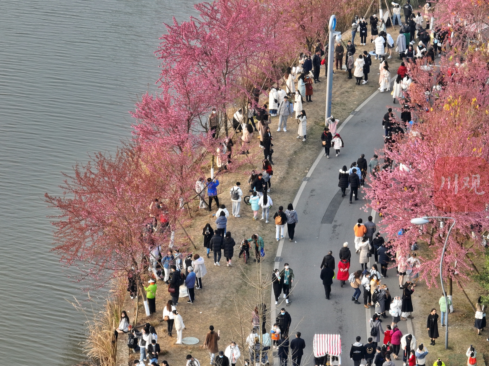 1月1日下午,柔和的阳光洒在成都青龙湖上,波光粼粼。湖边上的冬樱花正怒放盛开,给冬日注入了温馨的“春色”。记者在现场看到,不少市民驻足在冬樱花下拍照打卡,夕阳打在花上和脸上,浪漫不已。