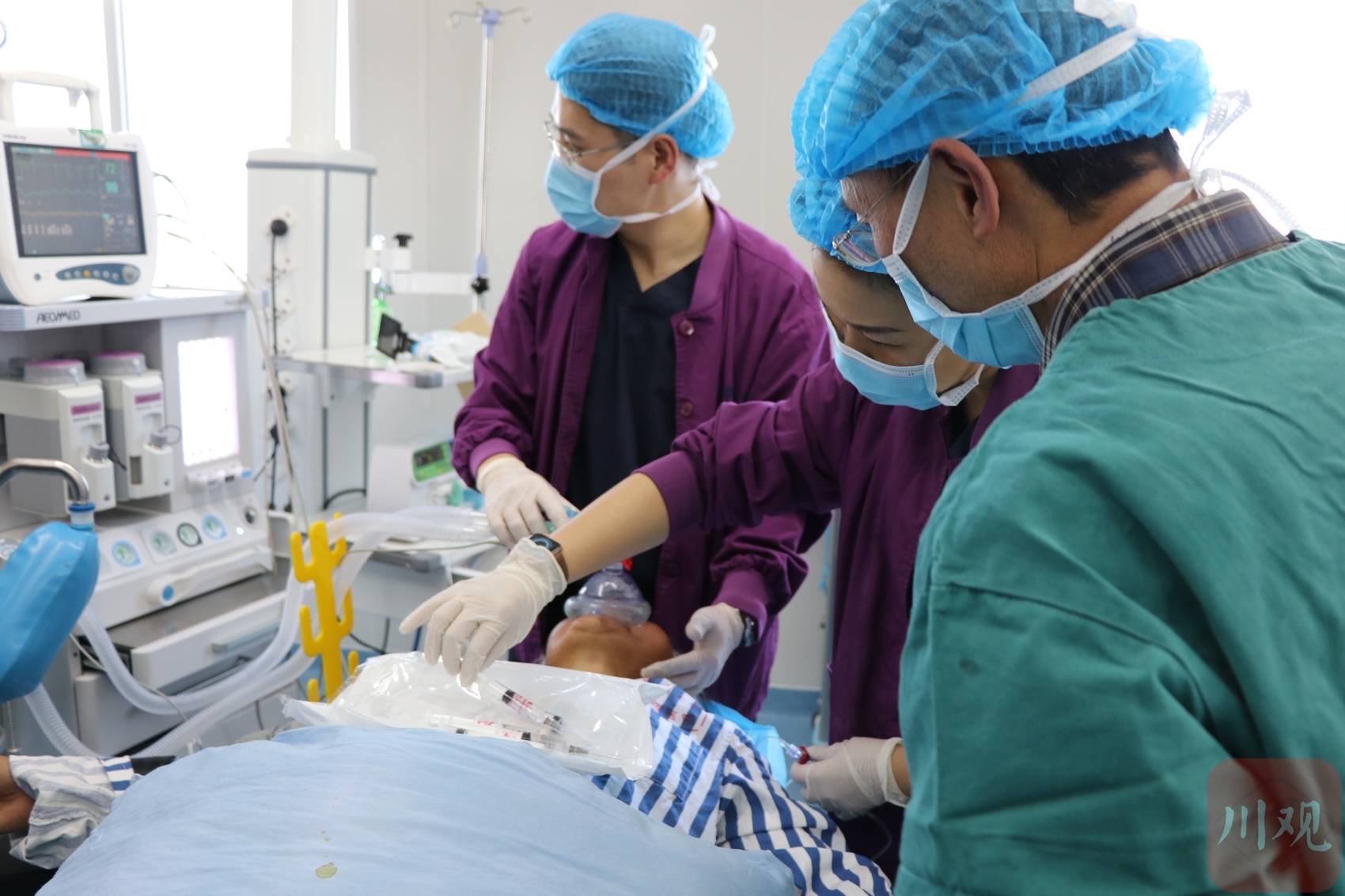 不到9点,患者尼拉被推进了手术室。朱涛率麻醉团队为患者做了充分的术前评估,综合考虑患者身体情况,以及若尔盖县人民医院的麻醉仪器,药品配置后,决定为其采用全身麻醉的方式。麻醉前为患者进行隐神经阻滞,既能减轻患者的疼痛,又不影响患者下肢肌力,有利于患者术后尽快开始膝关节功能恢复训练。