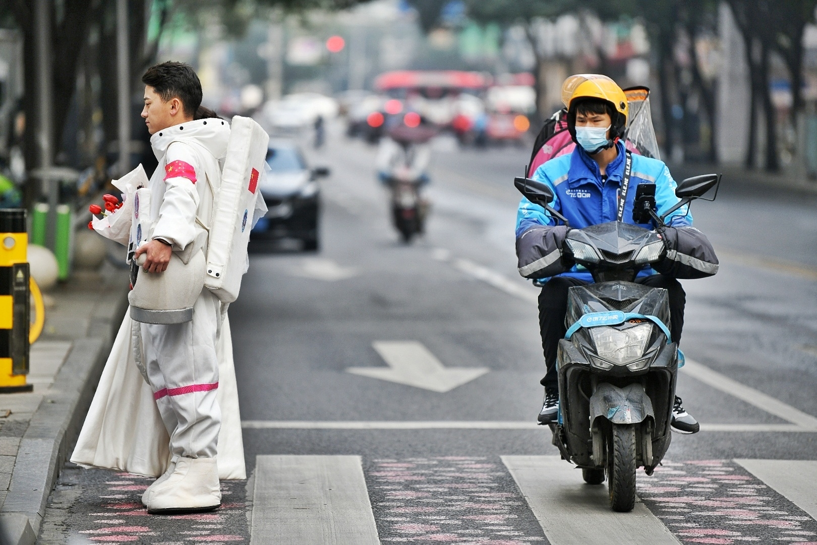 今天是元旦假期第二天,天仙路上着“宇航服”的小伙在拍婚纱照,小巷里的美食诱惑,让墙边都坐满了食客。天府广场和东大街、纱帽街上依然热热闹闹、熙熙攘攘。