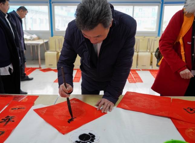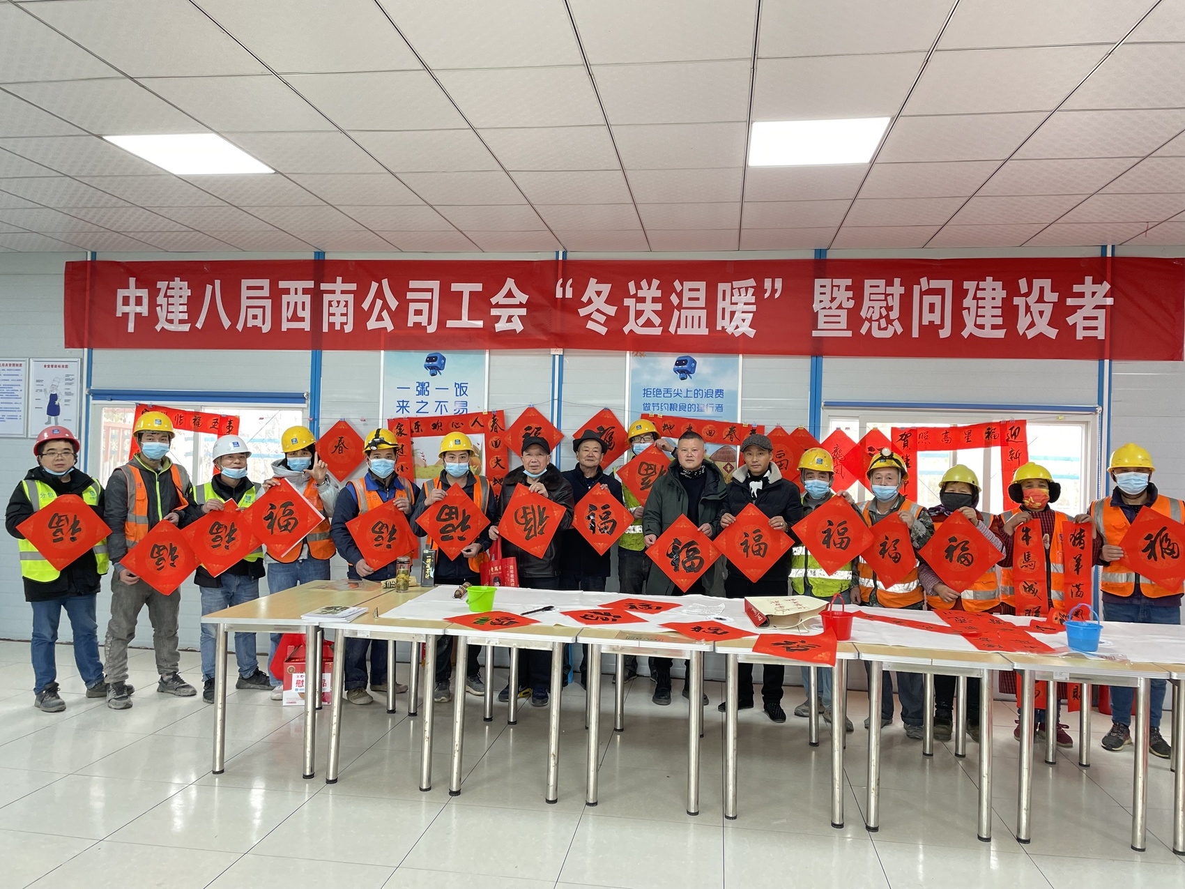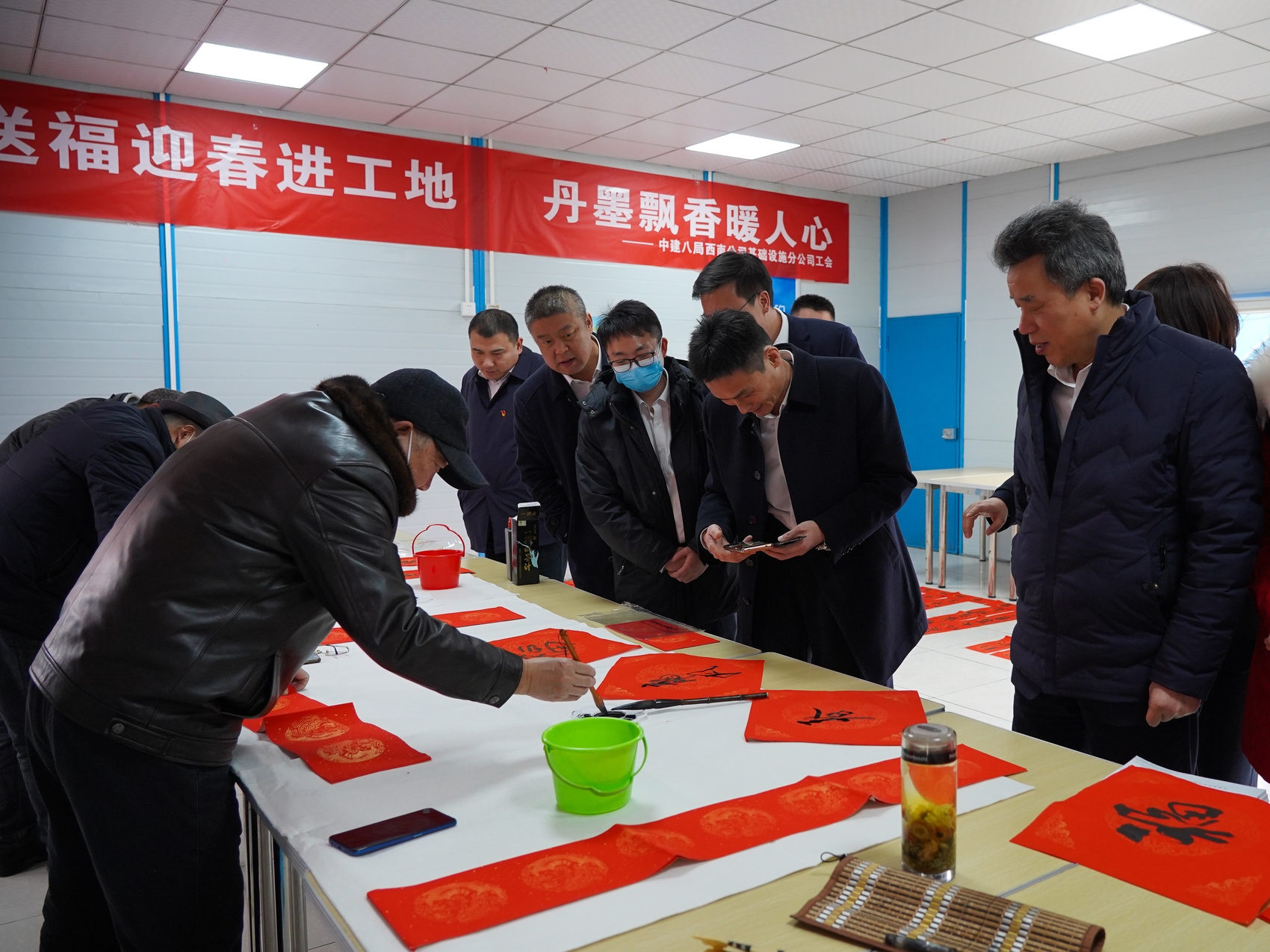 “今天,书法家现场给我们写春联、送‘福’字,让我在新的一年收到的最温暖的礼物了,我要把这个福气带回老家,贴在老家的主门上。”1月2日,从事机电作业的严定国师傅手捧着“福”字,脸上露出欢喜的笑容。这天,中建八局西南公司基础设施分公司工会邀请成都市高新区乡情国画院书法老师走进成都环城生态综合修复项目工地开展“送福迎春进工地,丹墨飘香暖人心”为主题的送“福”活动,为即将返乡“过大年”的施工一线建设者们写春联、送“福”字,现场气氛热烈,到处洋溢着浓郁的年味儿。