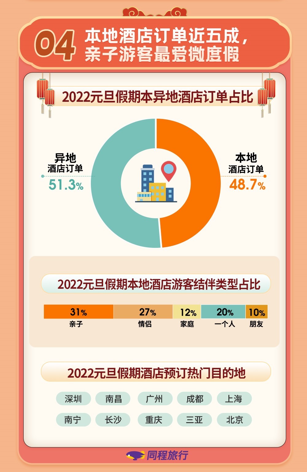 元旦假期酒店预订热门目的地分别为深圳、南昌、广州、成都、上海、南宁、长沙、重庆、三亚和北京。本地酒店订单占比达到48.7%。预订本地酒店的游客中,亲子游客占比最高,为31%。