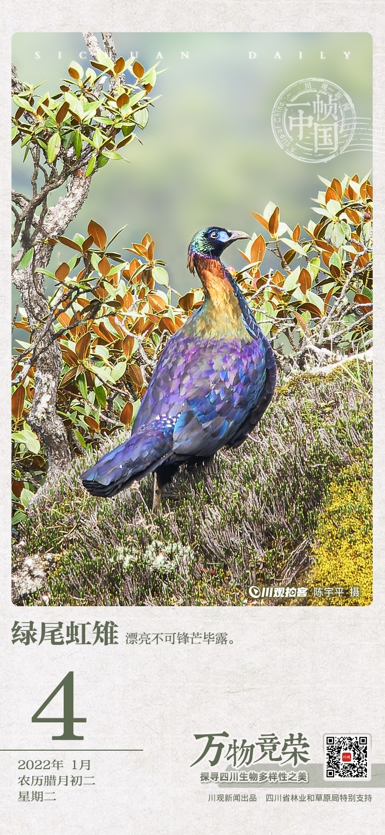 大熊猫国家公园四川卧龙片区山高谷深、沟壑纵横、植被丰茂,这里不仅生活着国宝大熊猫和雪豹,也栖息着中国特有的珍稀濒危雉类——绿尾虹雉。