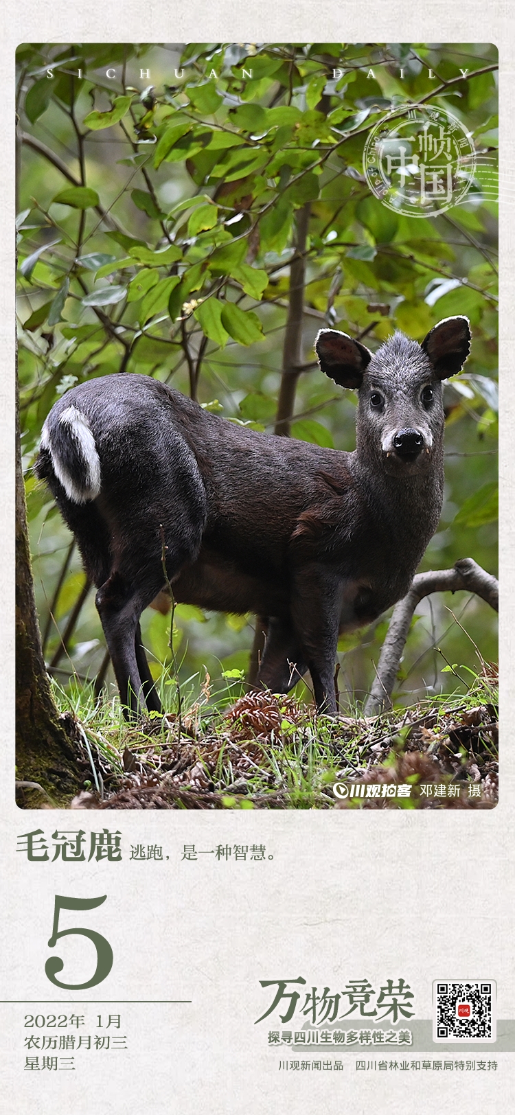 光影摇曳的丛林中,忽地蹿出一只小鹿,毛发黝黑发亮,四肢修长“pose”优雅。圆圆的大眼睛,透出一丝机警。它就是国家二级保护动物毛冠鹿。