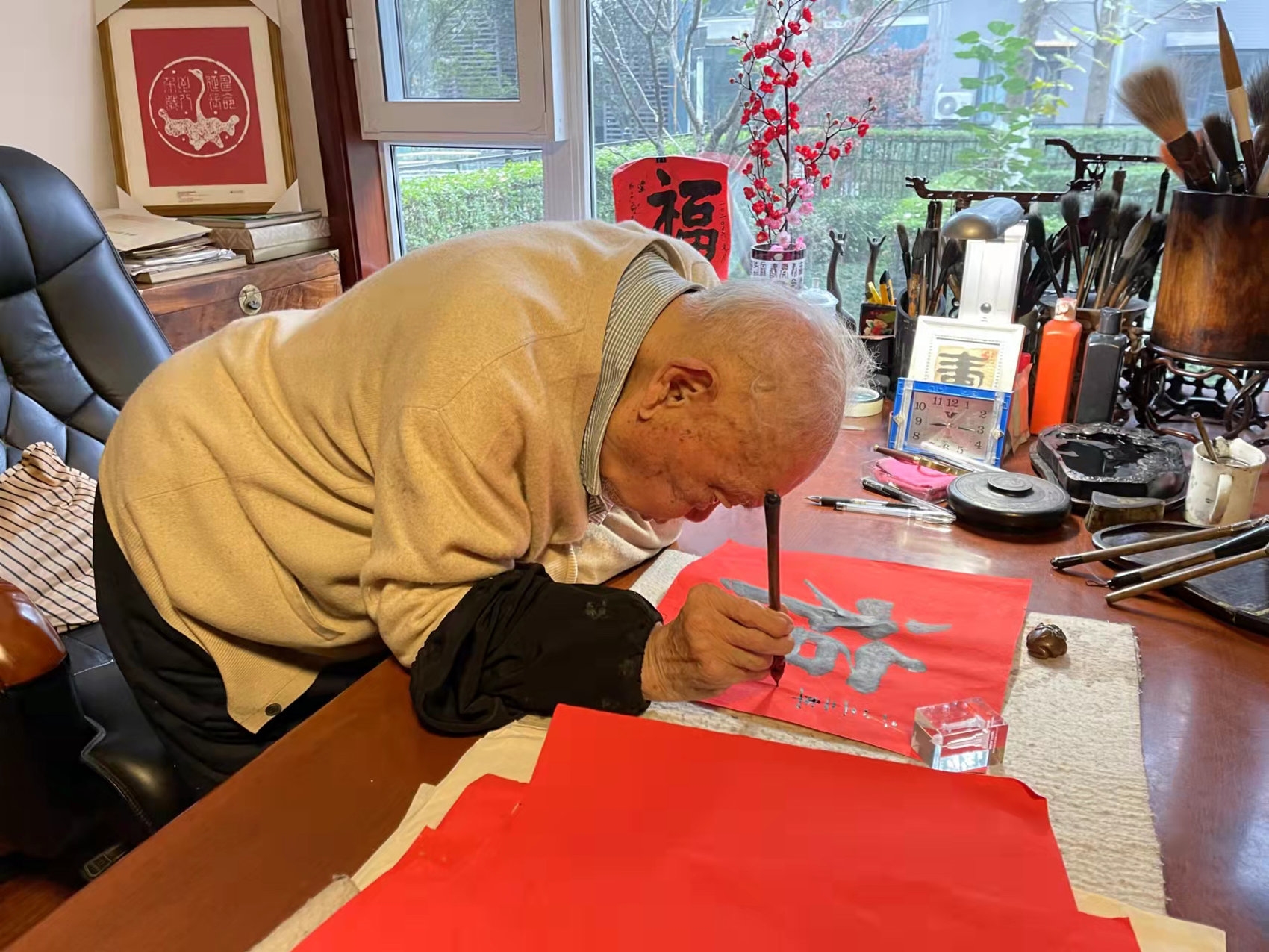 昨日,是2022年的第一个工作日,也是“四川大学马识途文学奖”捐赠仪式之日,阳光明媚。上午去单位的路上,接到了马识途先生女儿马万梅老师打来的电话,让我去取马老刚书写的“福”和“寿”字。想到这是茶寿老人新年写的第一个福寿,就觉得自己十分的幸运。
