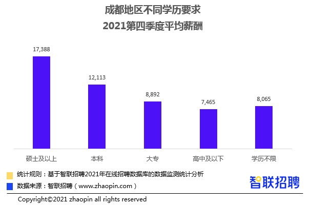 《报告》显示,从学历要求看,2021年第四季度薪资水平仍然整体呈现学历要求越高,招聘薪酬越高的特征。成都地区硕士以上学历招聘月薪第一,为17388元/月。
