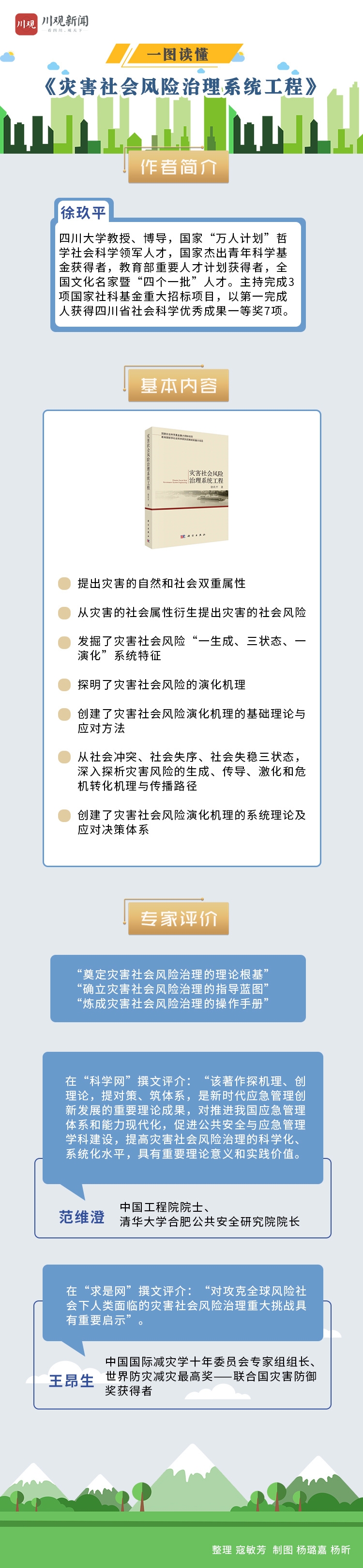 基于应对特大自然灾害的国家重大需求,自2008年汶川特大地震以来,四川大学校长助理、商学院院长徐玖平教授带领近百人研究团队,历时10余年,从经济、社会、管理、技术、政策等角度,对灾害社会风险进行系统化研究,完成《灾害社会风险治理系统工程》。
