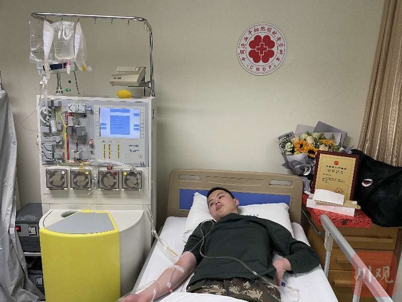 1月6日上午8点半,在四川省人民医院血液科的病床上,采集造血干细胞的分离机正在运作,捐献志愿者卯生智静静躺在病床上,鲜红的血液从他手臂上抽出进行分离。