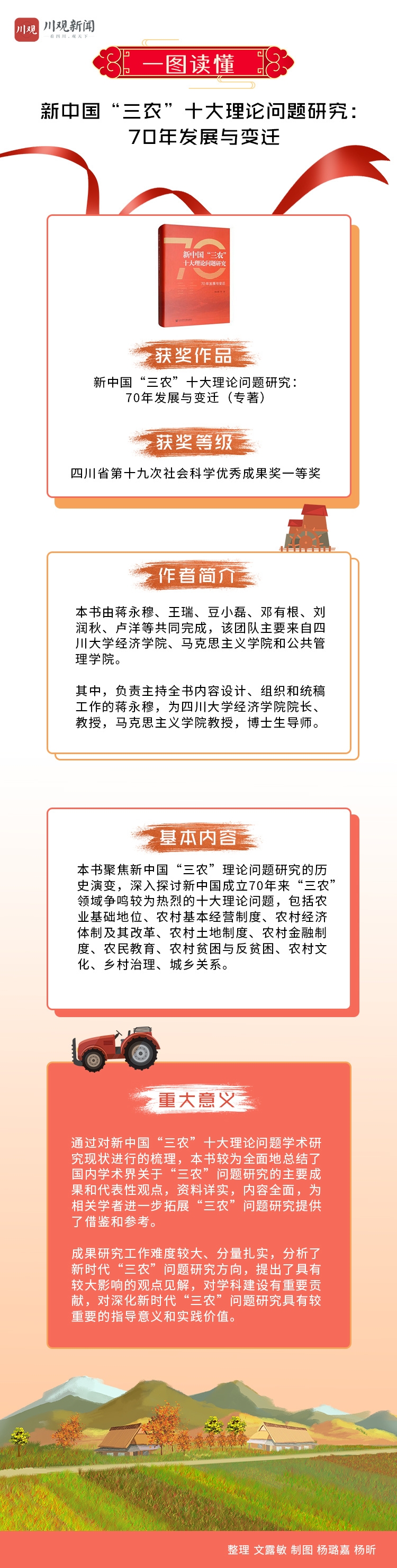 这本刚刚获得四川省第十九次社会科学优秀成果奖一等奖的著作,就是对蒋永穆口中的“成果”的研究——通过对新中国成立以来“三农”领域争鸣较为热烈的十大理论问题进行探讨,深度聚焦新中国“三农”理论问题研究的历史演变。从选题到成稿,此书先后修改了7版,历时2年,最终于2019年12月顺利出版。