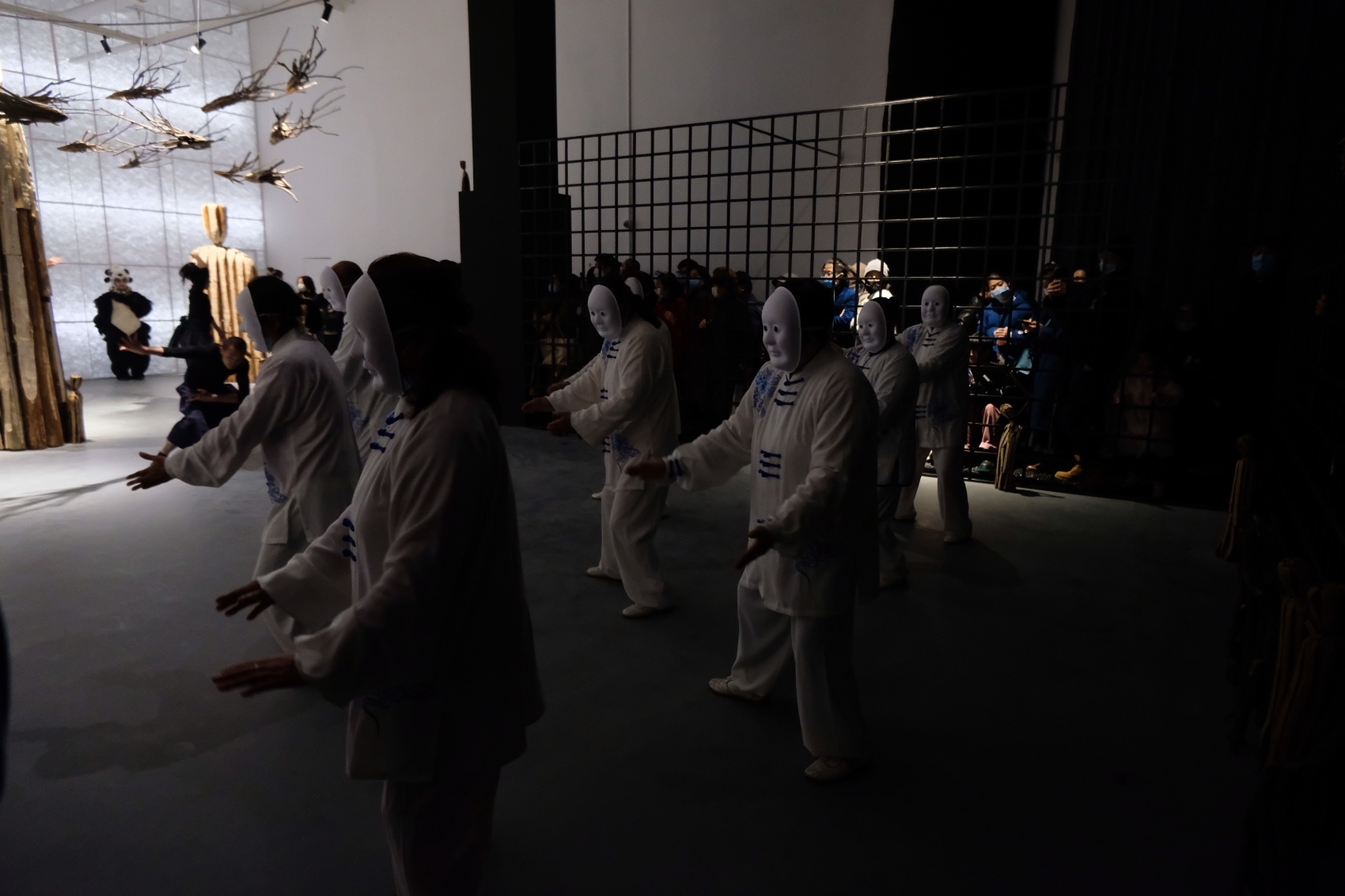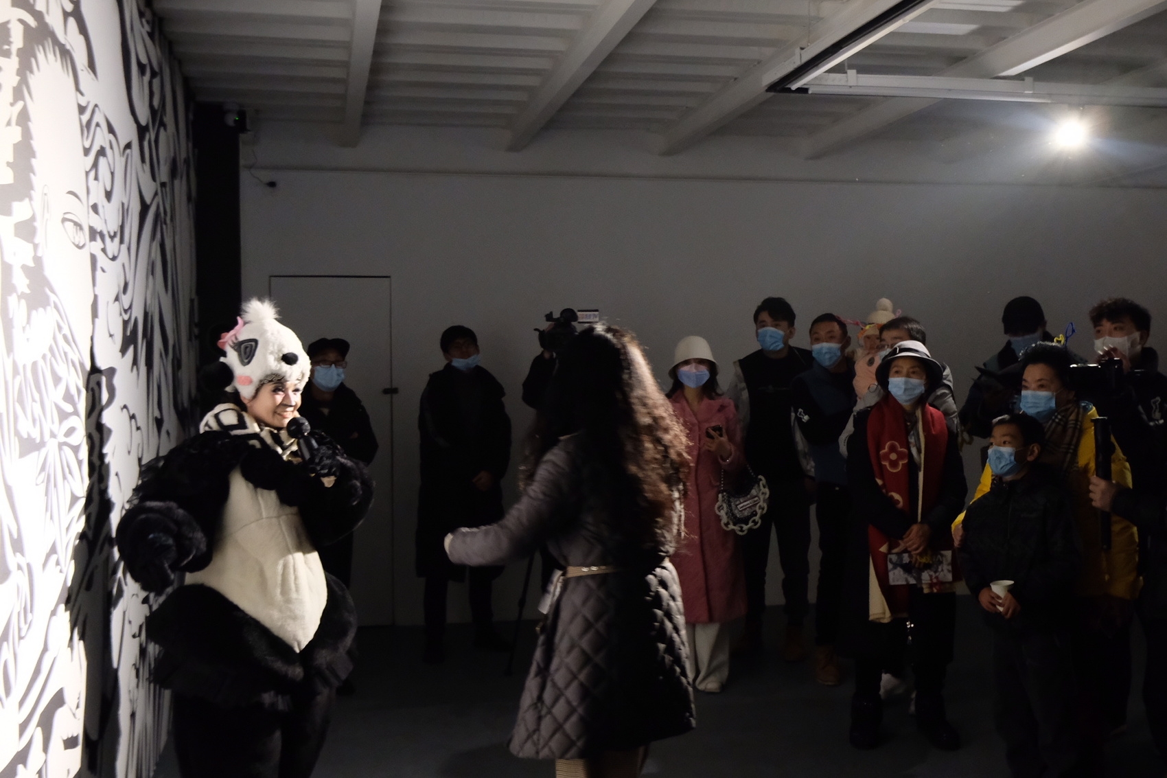 一位演员拿起手机开始自拍,这个细节仿佛在我们的生活随处可见,一段和手机在一起表演的充满现代感的舞蹈开启,跟着熊猫人走进艺术空间里,表达越来越深入,一场肢体跨界音乐、摄影、绘画、艺术空间的旅程开始……