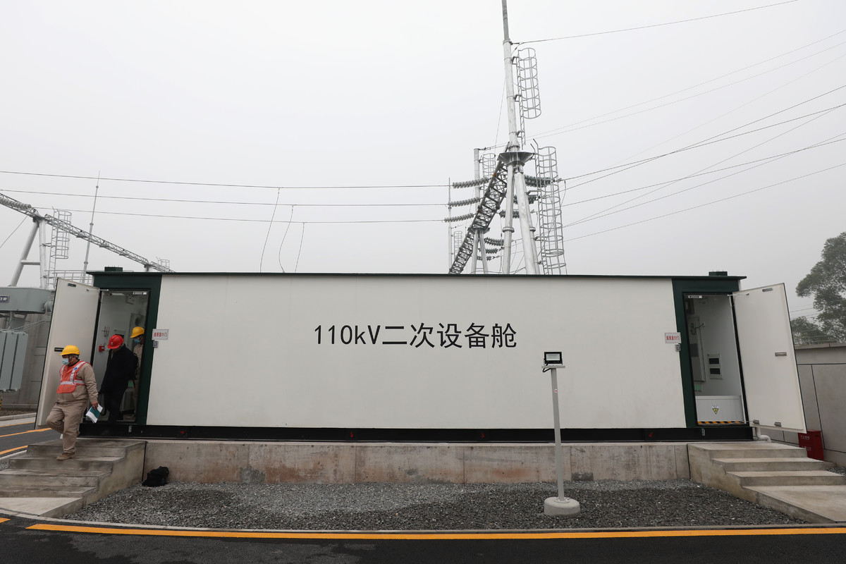值得一提的是,在变电站内有一栋小房屋,外面写着“110千伏二次设备舱”。这正是该变电站的亮点之一——采用“预制舱”智能化技术手段开展施工。