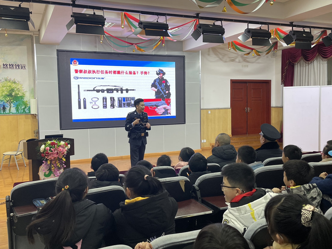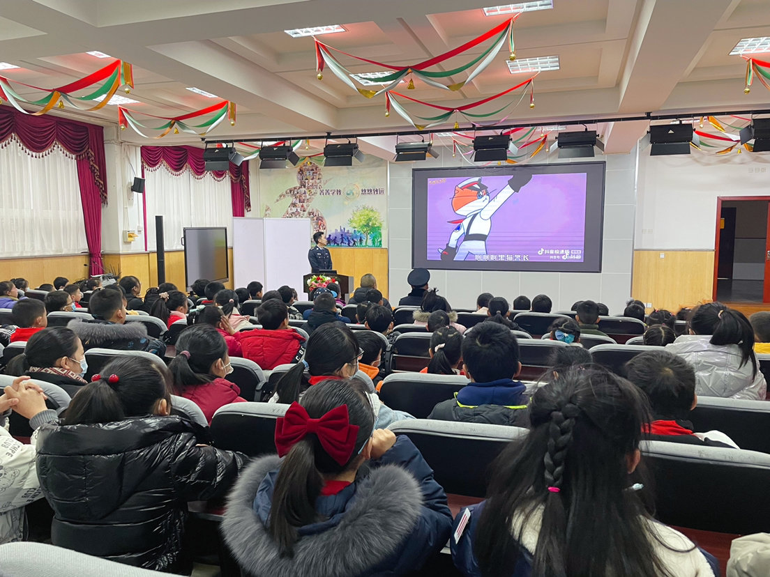 活动最后,詹承宏教导员和民警江洁一同祝愿现场师生新年快乐、寒假开心,全体同学自发起立大声齐喊:祝警察叔叔节日快乐!