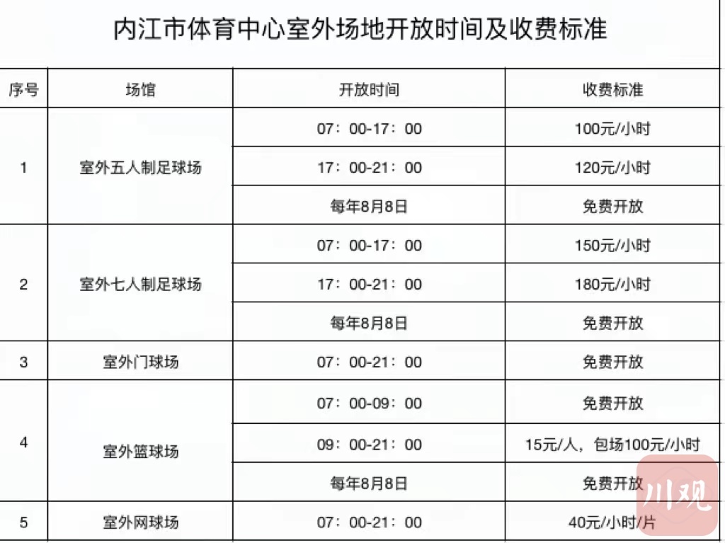 在收费标准上,每年8月8日的全民健身日全天免费开放,其余时间段按照《内江市体育中心场馆开放时间及收费标准》正式收费。试运行期间市民对定价、运行时间等的意见建议等情况收集后,内江市体育中心后期全面开放将综合考虑市民呼声对运营策略的安排做出进一步优化。
