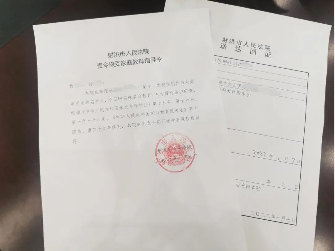 1月10日,记者从射洪市人民法院获悉,近日,该院在审理一起未成年犯罪案件中,对被告人的父母发出《责令接受家庭教育指导令》。这是《中华人民共和国家庭教育促进法》正式实施后,遂宁发出的首份指导令。