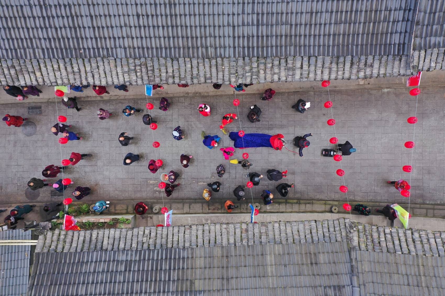 早上10时许,“牛儿灯”队伍沿着张灯结彩的大同古镇老街载歌载舞,锣鼓喧天,唱腔悠远,“牛倌”与“耕牛”装扮生动、娴熟诙谐,吸引了游客和居民观看、拍照,邛崃大同“牛儿灯”也成为了牛年末尾的人文与氛围担当。