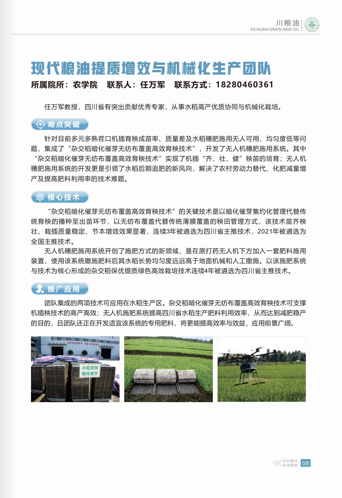 据四川农大新农村发展研究院副院长饶远林介绍,以往学校会编写学校科技成果宣传册,但是一般是按照各个学院的顺序,介绍各个单一的科技成果,学科思维比较强,本次则完全是对照“乡村振兴产业推进”需要,进行了集成组装,101支科技服务团按照川粮油、川猪、川牛羊禽、川鱼、川果、川茶、川菜、川药、川竹等产业体系呈现,每个团队的联系人、电话都在其中。“希望地方政府、企业拿到册子,可以一目了然,根据所需找到相关产业发展的专家,方便对接。”