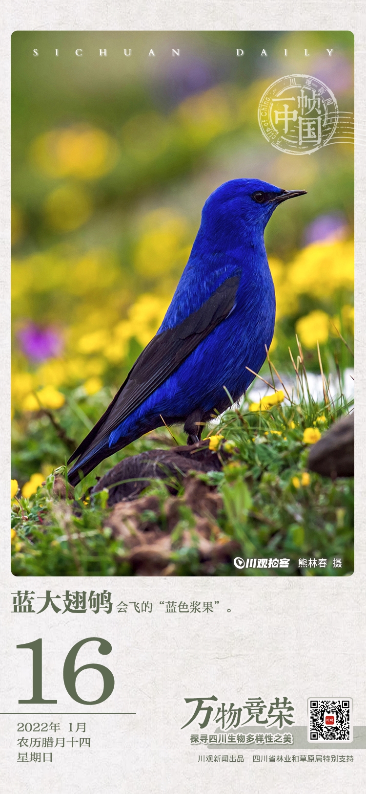 如果你有幸偶遇蓝大翅鸲,一定也会被这只通体呈鲜紫蓝色、散发出金属光泽的鸟儿吸引。蓝大翅鸲是一种高山鸟类。夏季,它们栖息于海拔3500米至5500米左右的高山森林灌丛,以及多岩石的高原草地;冬季,则会下降到3000米以下的丛林中。沿喜马拉雅山向东至缅甸北部以及中国的甘肃、青海、四川、云南、西藏等地,都能瞥见它的踪影。