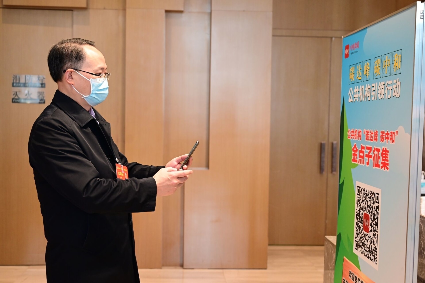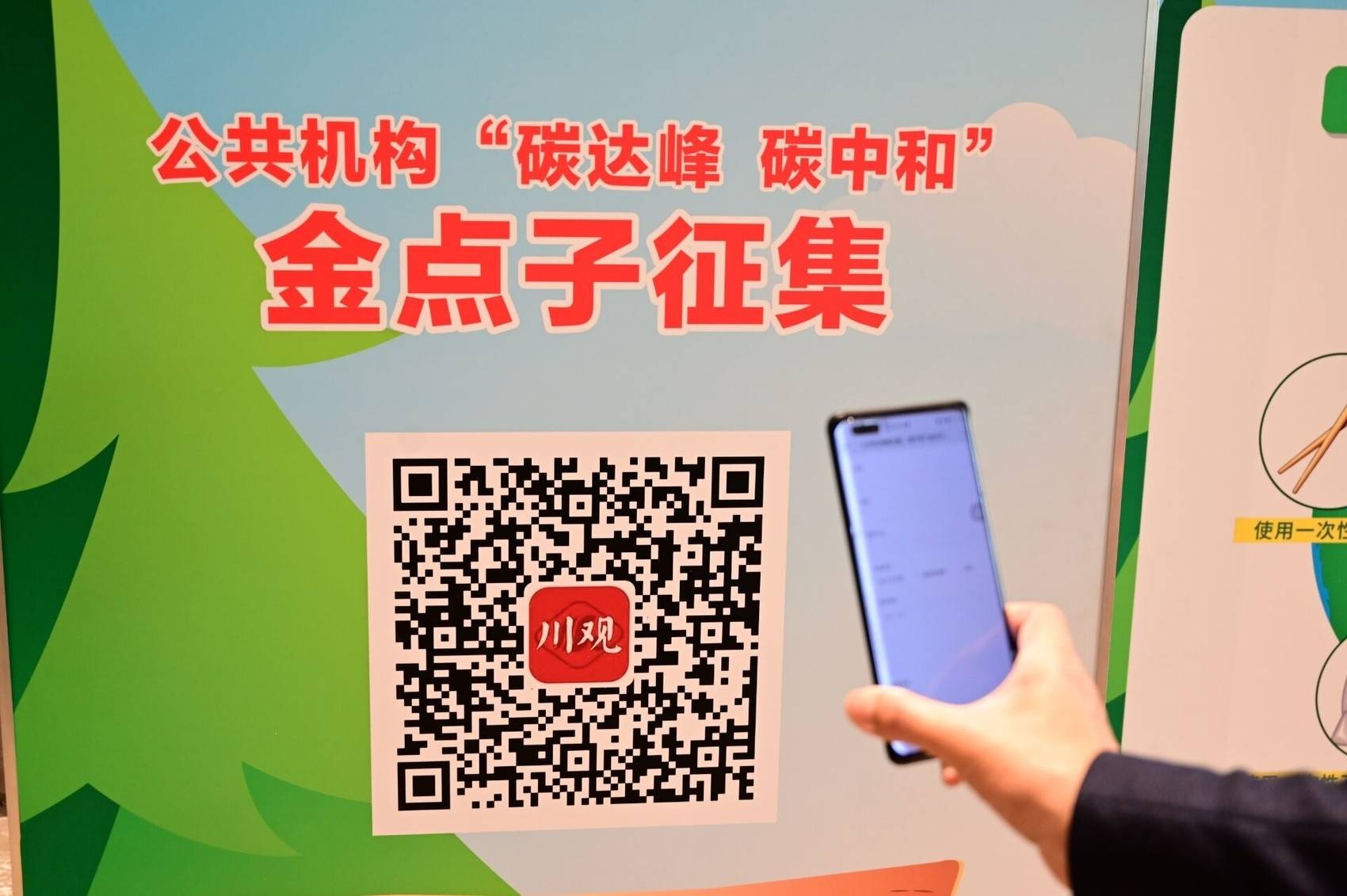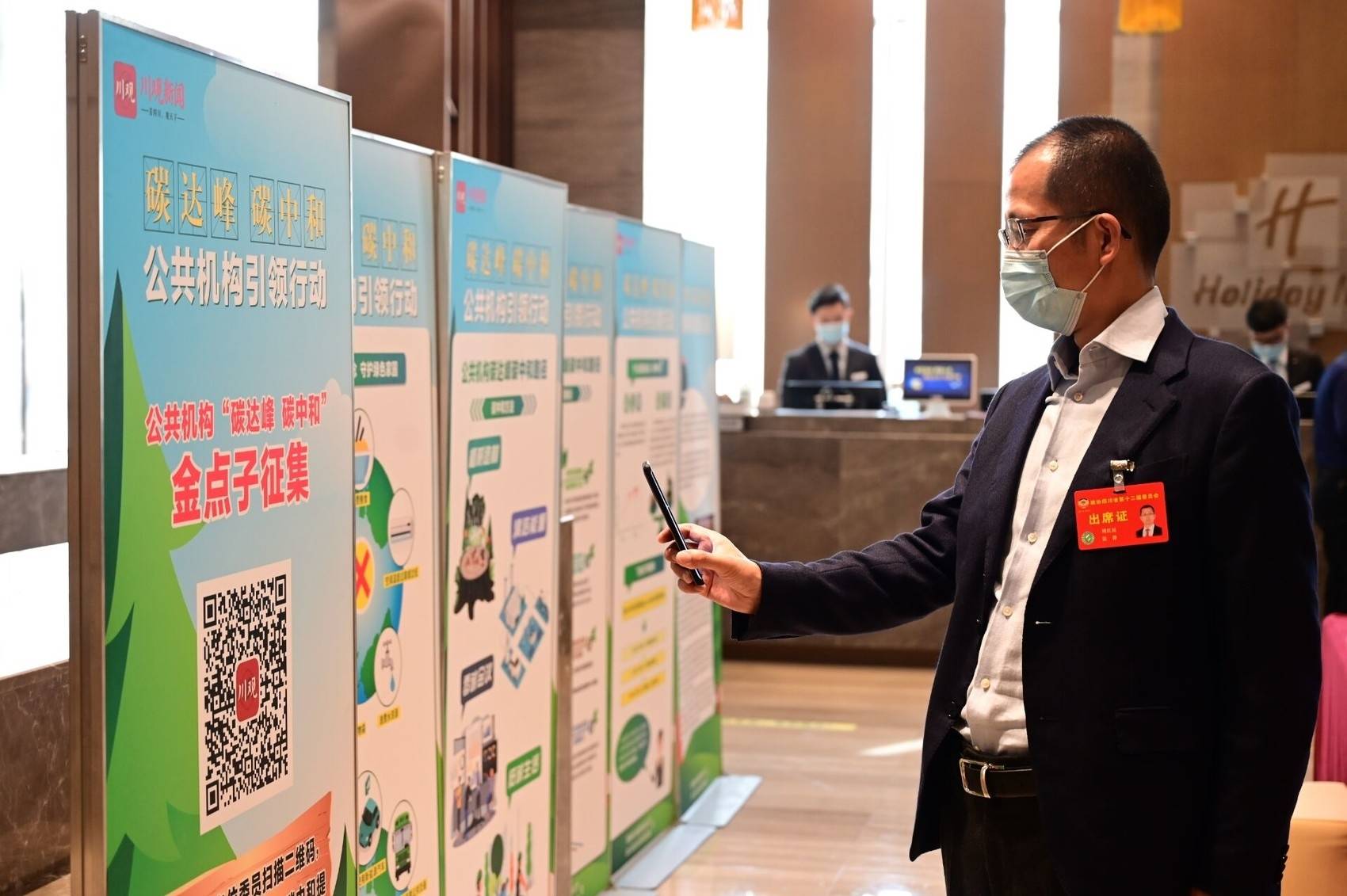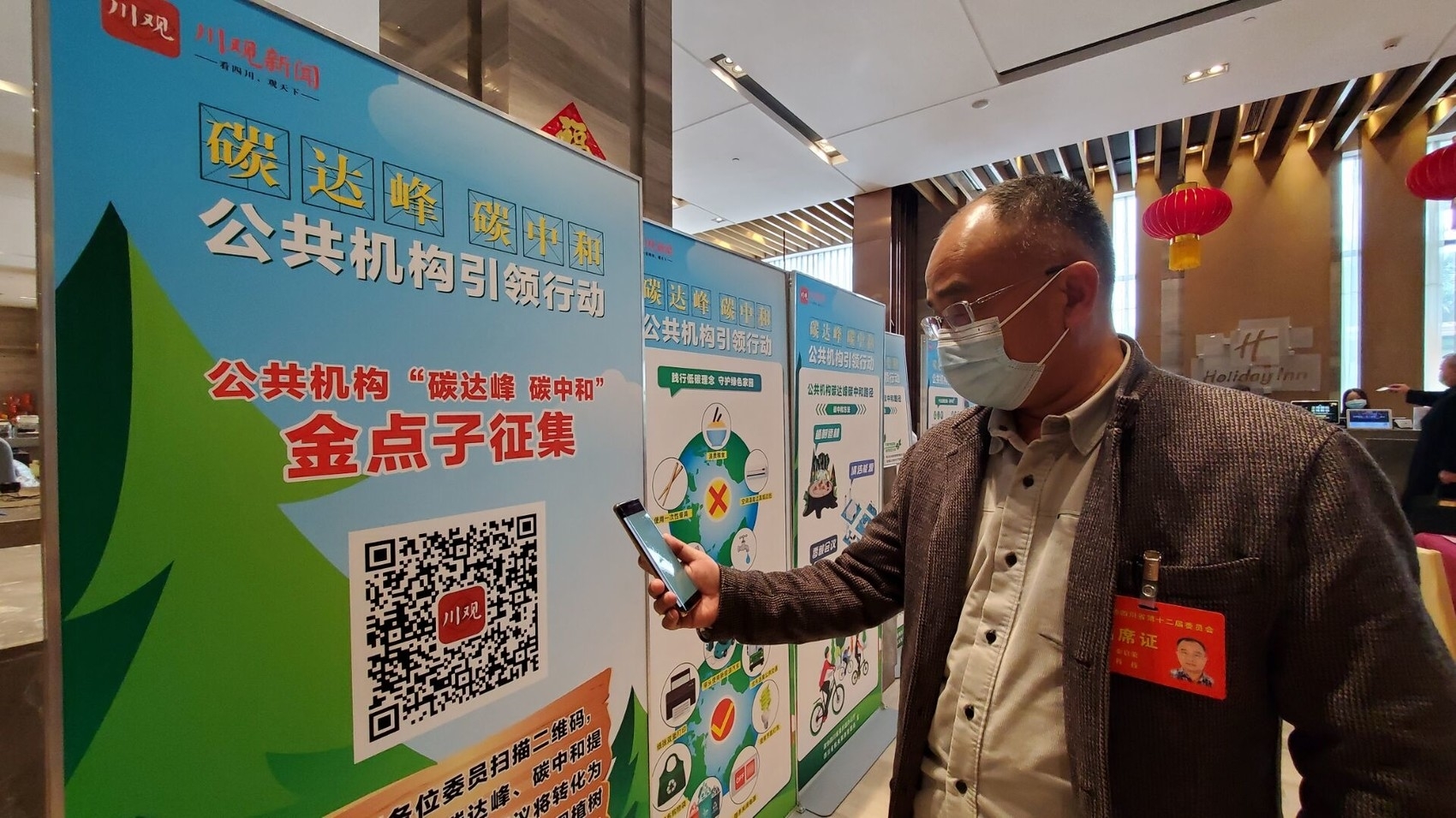 “扫码提建议,就有机会将建议变成实体树,种植在成都,这个有意思!”1月16日,准备出席省政协十二届五次会议的省政协常委、提案委副主任周红民,在成都市新希望高新皇冠假日酒店驻地完成报道手续后,被大厅处的6块展板吸引住。拿出手机扫描上面的二维码访问川观新闻,他兴致勃勃地参加当日启动的公共机构“碳达峰 碳中和”金点子征集活动。