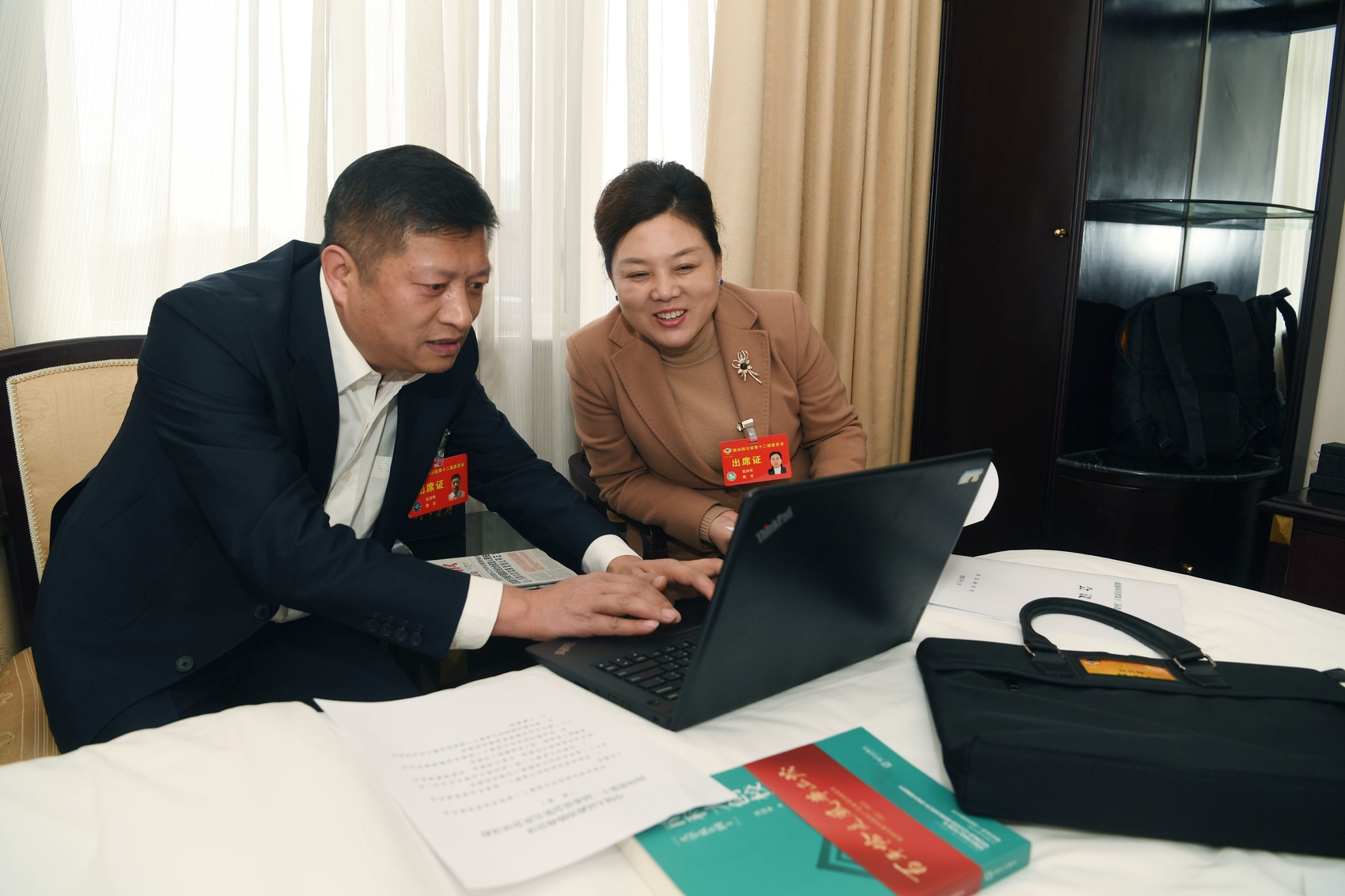 1月16日下午,教育界别高善峰委员(左)和包国容委员(右)在驻地共同完善《发挥我省高校在服务乡村振兴战略中的重要作用》的提案