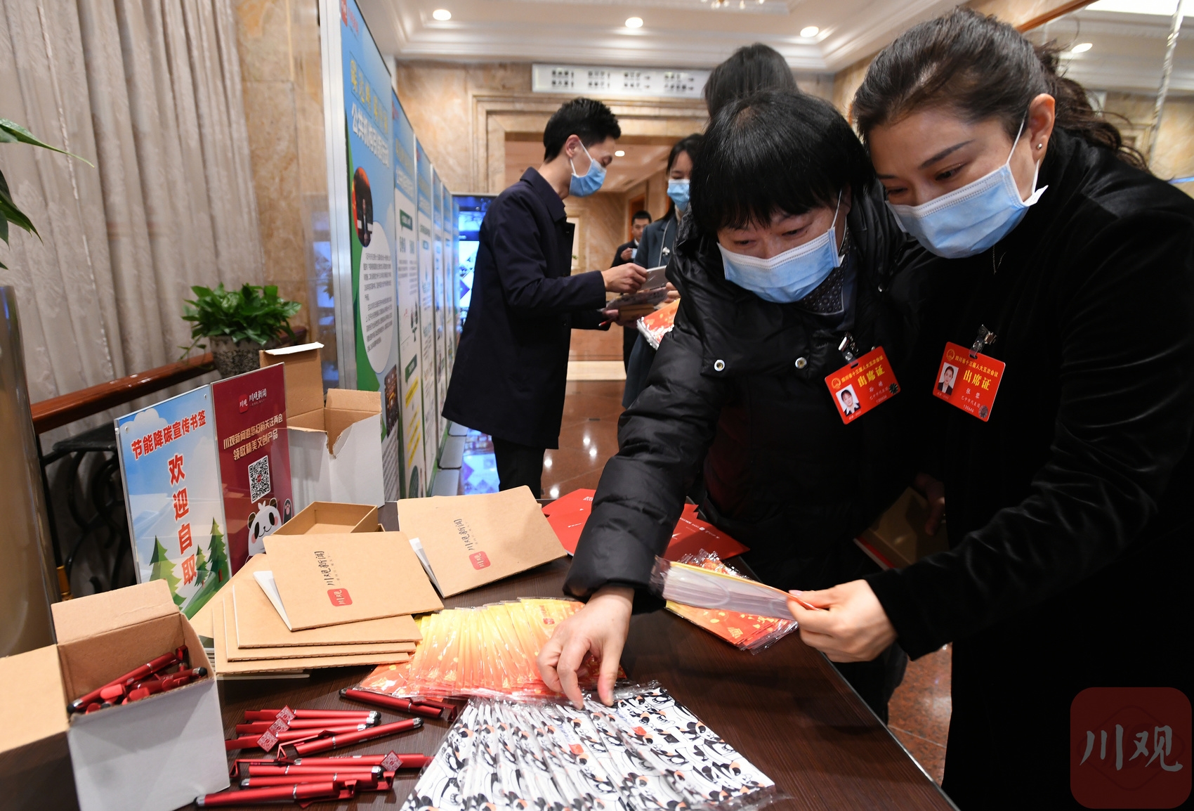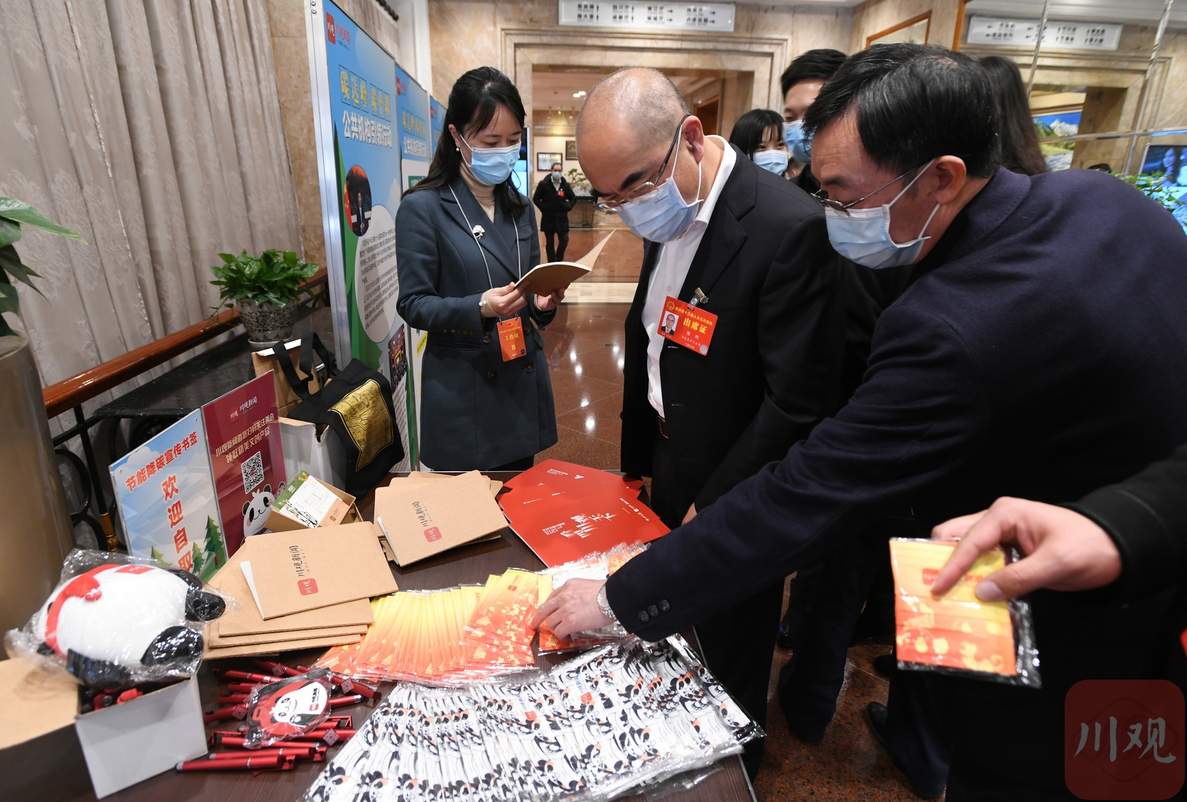 1月17日,川观新闻文创产品——“川宝”、三星堆环保布袋、笔记本和熊猫创意口罩等亮相省人大代表驻地,吸引了代表们的目光。