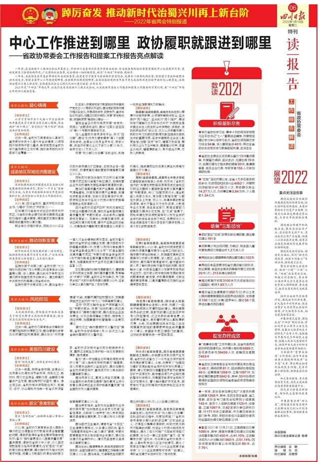 今天四川日报的第五版和第六版,是两个整版的“省两会特别报道”。第五版的版名为“深聚焦”,主要传递代表委员的精彩观点,第六版的版名为“读报告”,主要是解读省政协常委会工作报告和提案工作报告之中的亮点。