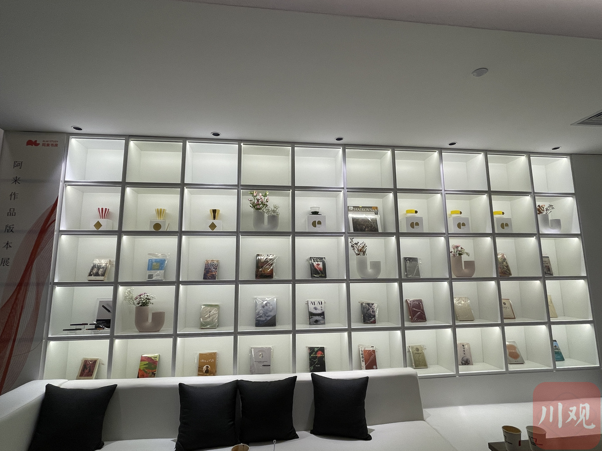 在阿来书房内,还有一处精心打造的名家会客区。阿来书房雅启,名家会客区的书架上,也庄重陈列着书房主人阿来众多代表性作品。其中,既有阿来成名作、茅盾文学奖获奖作品《尘埃落定》自问世以来的9个中文版本和英语、德语、波兰语、意大利语等7种外语和少数民族语言译本,也有《空山》的英文、法文、日文、俄文译本,《遥远的温泉》德文译本,《蘑菇圈》德文译本。众多的著作版本和作品译本,无不彰显着阿来蓬勃的文学创造力和广泛的文学影响力,吸引了活动嘉宾、读者驻足拍照。