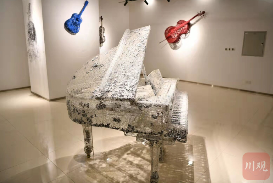 知名艺术家师进滇,擅长以钢丝编织成各种物体的形态,作品被世界多地艺术馆所收藏,也曾与爱马仕等知名品牌合作。此次展览展出了他的以乐器形态为题材的多个装置作品,包括吉他、大提琴以及一架三角钢琴。坚硬的不锈钢丝经由艺术家之手编织成为优美的乐器元素,镂空与透视,让人充分感受到艺术的蓬勃创造力,吸引了不少人关注。