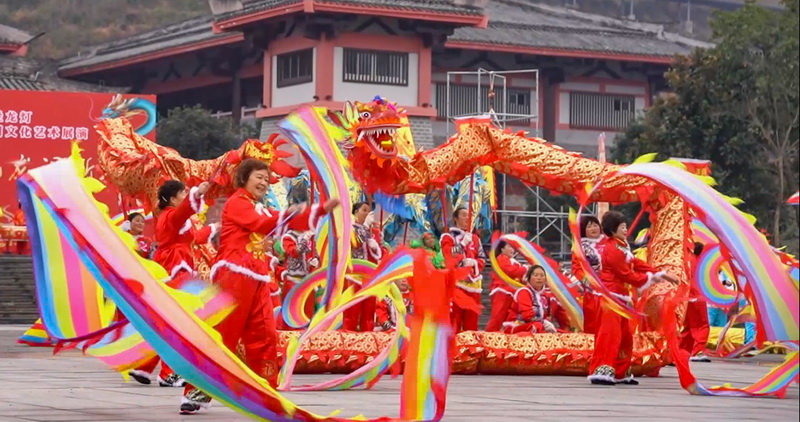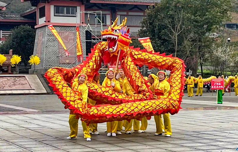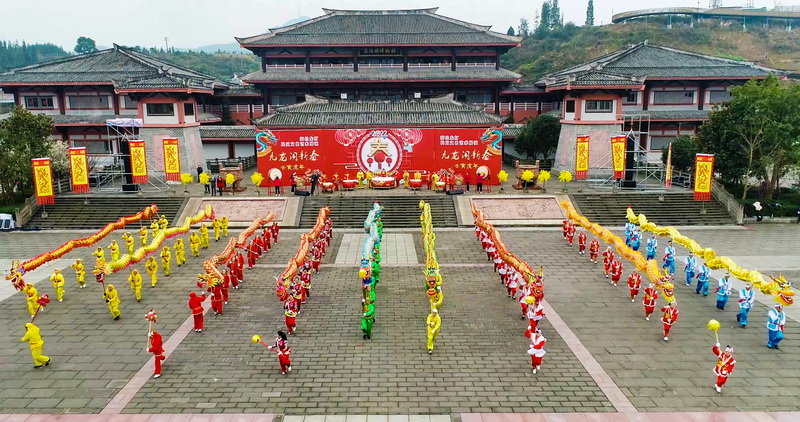 舞龙表演分为报春、争春和闹春三个篇章。其中,报春篇章中出现的“云峰桢楠王”,“龙凤呈祥”,“龙门大吉”等九组造型,以荥经地方特色文化命名,形象栩栩如生。争春篇章九龙翻滚腾跃、各显神通的精彩场面,意在体现斗龙赛龙、竞相争春的荥经精神。闹春篇章则呈现出“2022”造型,寓意新的一年荥经更美好。
