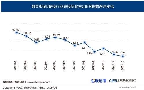 尤为值得关注的是,2021年7月国家“双减”政策正式出台,各地方政府也陆续发布了具体实施文件。可以看出,进入2021年第四季度,教育/培训/院校行业的高校毕业生招聘需求人数10月至12月逐月下降,而求职申请人数在11月份有小幅回升。从高校毕业生就业景气来看,CIER指数从年初的19.49下降至11月份和12月份的1.32和1.25,表明“双减”政策下对该行业的就业造成冲击和影响。