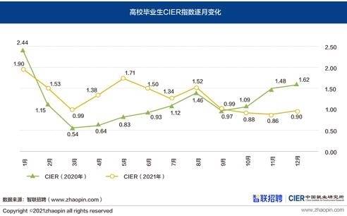 近年来,高校毕业生因其规模巨大,其就业问题一直备受关注。据相关数据显示,2022届高校毕业生规模预计1076万人,同比增加167万人。为准确刻画和客观反映高校毕业生就业市场状况,日前,中国人民大学中国就业研究所与智联招聘联合推出我国《2021年高校毕业生就业市场景气报告》(以下简称《报告》)。通过不同行业和职业、不同地区和城市、不同企业类型等供需指标的动态变化,并根据其制作出高校毕业生景气指数CIER,来反映2021年度我国高校毕业生就业市场上职位空缺与求职人数的比例变化,并对就业市场景气程度进行总体分析和研判。