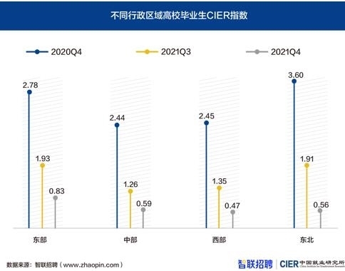 根据《报告》,随着国内疫情反复、经济下行等因素影响,2021年四季度高校毕业生景气指数CIER降至0.88,这是自2020年1季度疫情爆发以来,该指数的次低点(最低点为2020年二季度的0.79)。当前高校毕业生就业市场总量稳中承压,且结构矛盾依然存在。