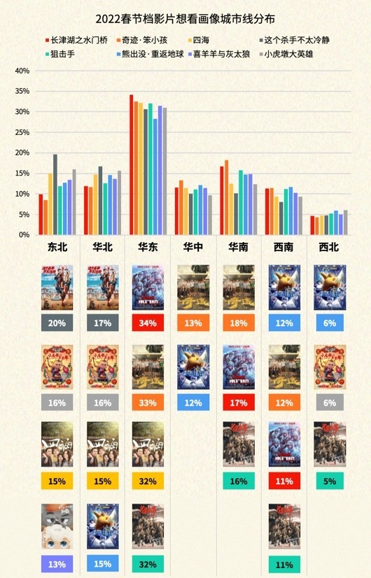 根据猫眼想看数据,不同影片被期待程度呈现出了地域化差异。除《狙击手》外,春节档其他7部影片都具有较高的下沉属性,在三四线城市中更具期待。从区域来看,北方市场《这个杀手不太冷静》《四海》两部具有喜剧元素的影片优势明显;《长津湖》除四线城市占比较高外,占比还领跑华东市场;《奇迹》以南方、华中、华东为优势区,《狙击手》相比更偏向西部地区。三部动画也各具特色,《小虎墩大英雄》北方观众想看占比更高,《熊出没·重返地球》偏向中西部,《喜羊羊与灰太狼之筐出未来》则在东北有一定优势。