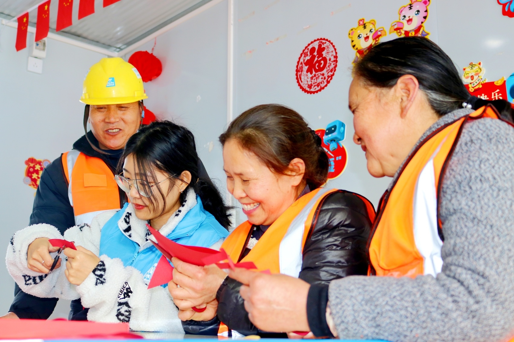 在成都温江区建设项目工地,大红灯笼高高挂,充满美好寓意的福字张贴在大门上,职工志愿者们正和农民工们一同开展丰富的年俗活动,包饺子、剪窗花、写春联,让工地上的职工之家看起来“年味”十足。