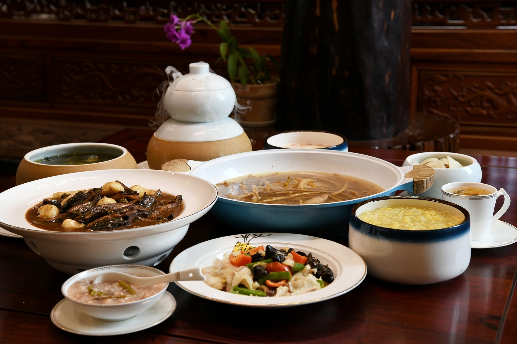 “大蒜烧鳝鱼”是川菜中家常味浓郁的菜肴,加入盘成节的石斛,味鲜的同时对人的气血两亏还有一定的功效。“石斛山珍石榴裙”外形很像“肚包肉”,只是用纯蛋清加生粉调制并煎成的“石榴皮”呈乳白色,调味成馅料的鸡胸肉、虾肉和石斛、菌丁被包裹成型,口感鲜香是拌饭佳品。“石斛汽锅鸡”在器型上用的是葫芦瓷罐,葫芦口内放干冰,上桌呈蒸汽缭绕,讨巧的观感加上新鲜石斛和乌鸡的碰撞,鸡肉鲜嫩、鸡汤咸鲜是一大特色。“石斛汁溜乌鱼片”,用青椒、红椒、大葱、姜片,新鲜石斛榨汁,滑熟起锅的乌鱼片更是以斑斓色彩让人眼前一亮,入口鲜爽、滑嫩的乌鱼简直回味无穷。“石斛花生米粥”、“石斛银耳羹”都是文火慢熬,清新的口感是药用食疗的养生佳品……最后再来一碗“石斛木瓜鲜奶”,石斛粉和鲜奶、木瓜、红枣、莲子、冰糖隔水炖熟,润肤养颜不在话下。