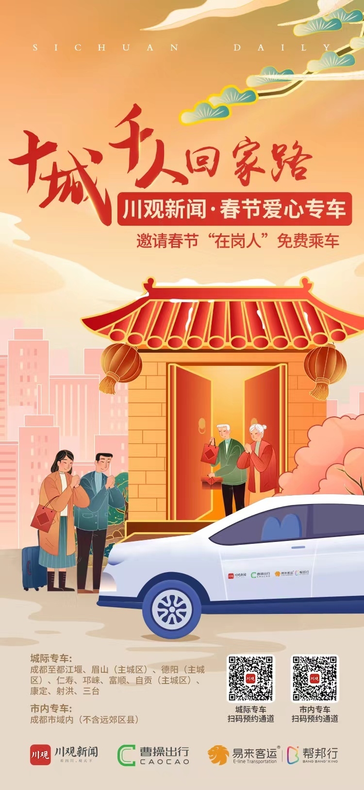 2022年1月25日17时至2022年2月6日18时,提供成都市指定范围内24小时出行以及城际专车间次免费预约服务。曹操专车平台及易来客运·帮邦行出行平台将免费接送在岗人,共同营造安逸祥和的美好生活节庆氛围。