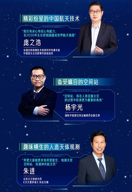 这堂太空知识公开课上,全国空间探测技术首席科学传播专家、中国首次太空授课专家组成员庞之浩,国际宇航联空间运输委员会副主席杨宇光,北京天文馆研究员、《天文爱好者》杂志主编朱进,科幻作家、第74届科幻雨果奖得主、童行书院创始人郝景芳,科学声音组织成员、腾讯视频知识创作者吴京平以及北京天文馆研究员、科普作家刘茜,多维度探寻宇宙的奥秘。