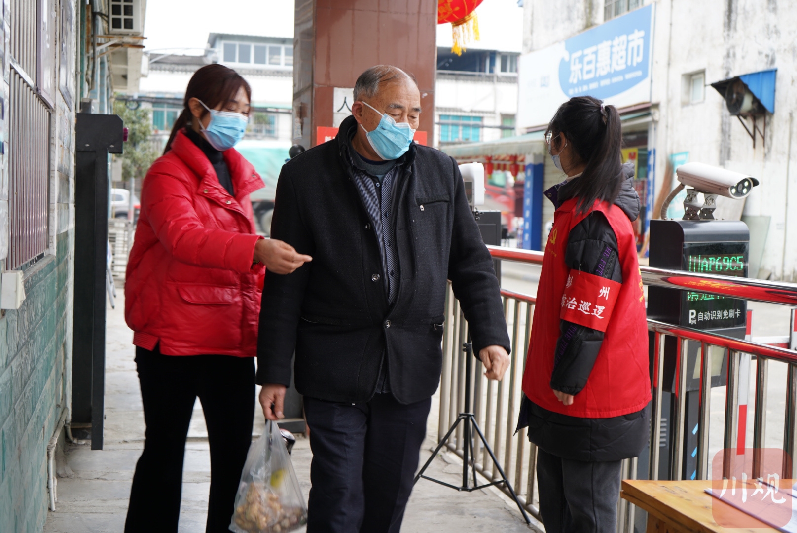 彭州市敖平镇兴平村金港湾小区,志愿者正在引导居民扫码、测温。魏冯 摄