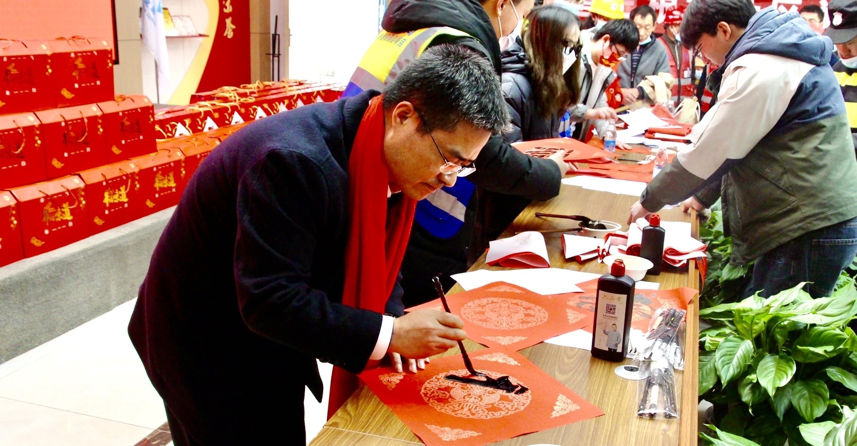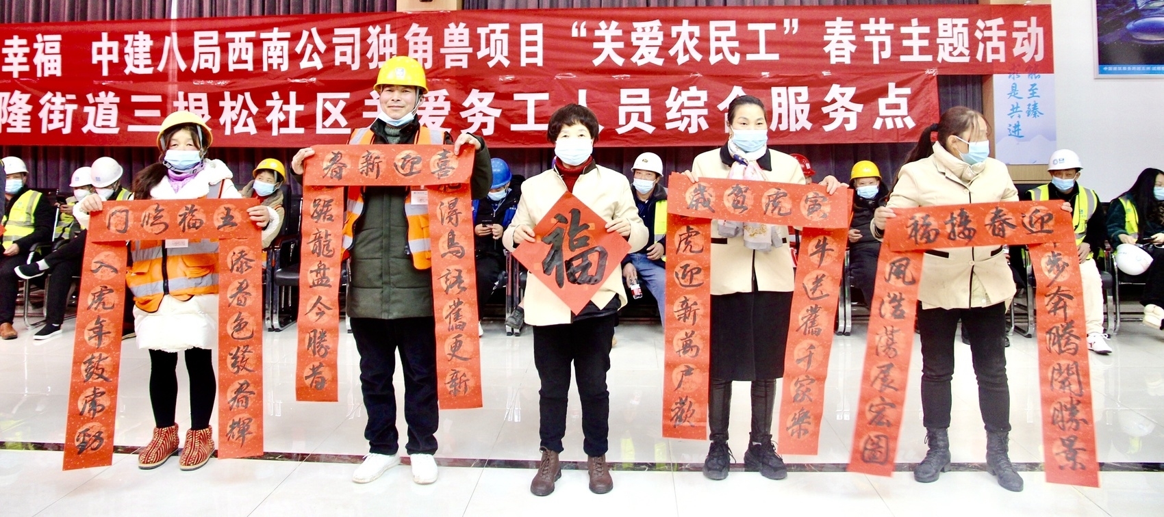 “年关将至,为答谢农民工朋友一年以来的辛勤工作,今天我们开设了‘爱心集市’,让他们在工地也能感受到浓浓的年味和温暖。”据项目工会负责人介绍,本次“爱心集市”包含了5个服务区域,除了吃团年饺子,农民工朋友还可以去理发区免费理发,到春联区领取书法协会老师“新鲜出炉”的春联,还可以去普法区免费咨询由兴隆街道三根松社区提供的法律讲解,在礼品区还能免费领取由项目部提供的新春大礼包。
