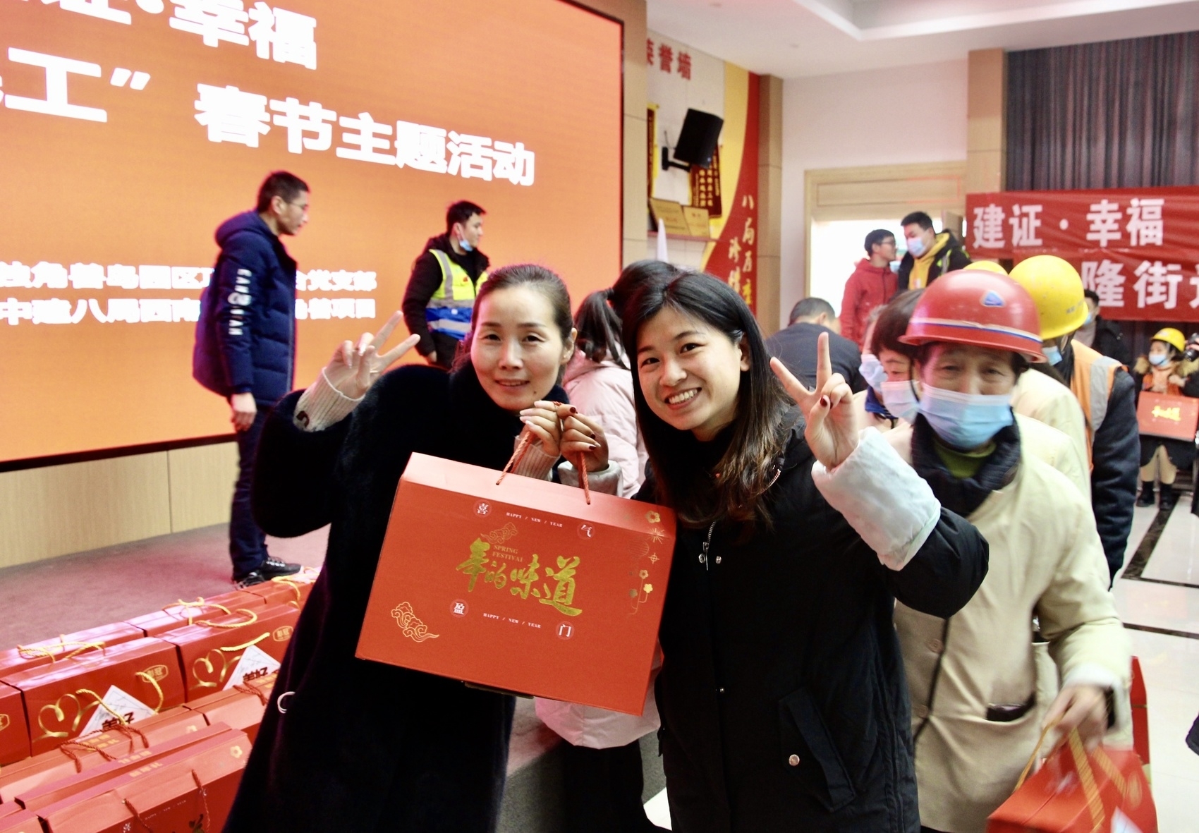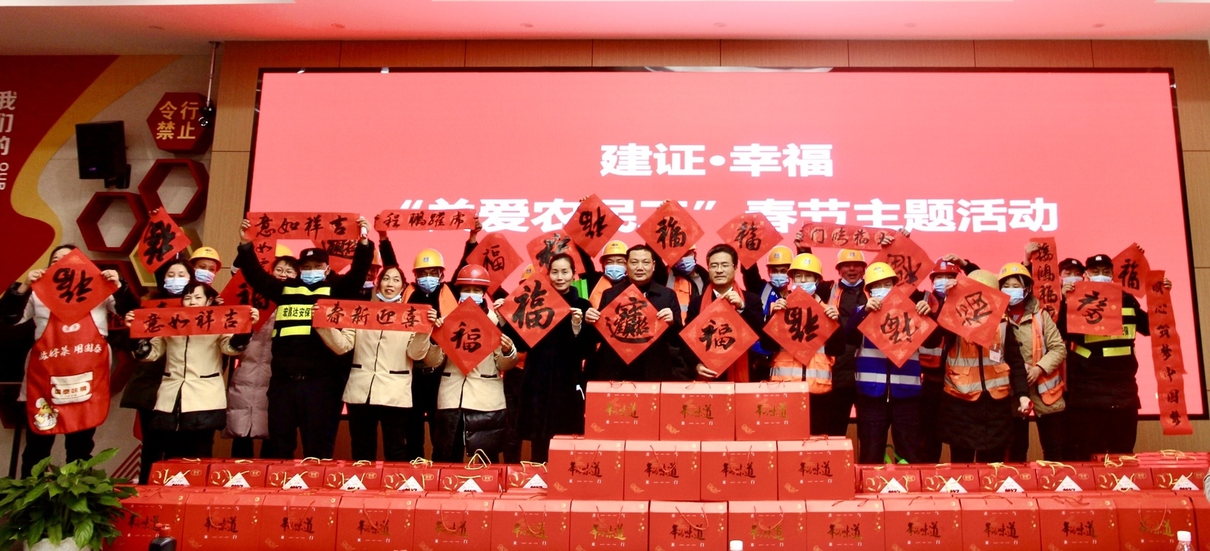 “再往左一点,可以了,挂上吧。”几名职工在大门口挂大红灯笼。离春节还有几天,但是整个项目部的“春节元素”已经处处可见。1月26日下午,由中建八局独角兽园区项目工会举办的,以“关心关爱农民工”春节主题的“爱心集市”开街啦。