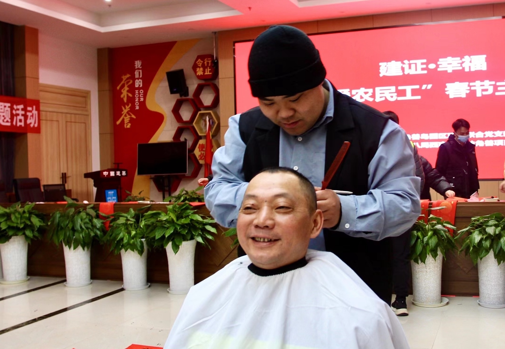 “师傅,您照照镜子,看看还有哪里需要改进的?后脑勺给您推短啦,太长了戴着安全帽干活不太舒服。”理发师再修剪完头发后,又贴心地刮了刮工人师傅下巴上的胡茬。“新的一年,从‘头’开始。”钢筋工张师傅摸着新发型开心地说。