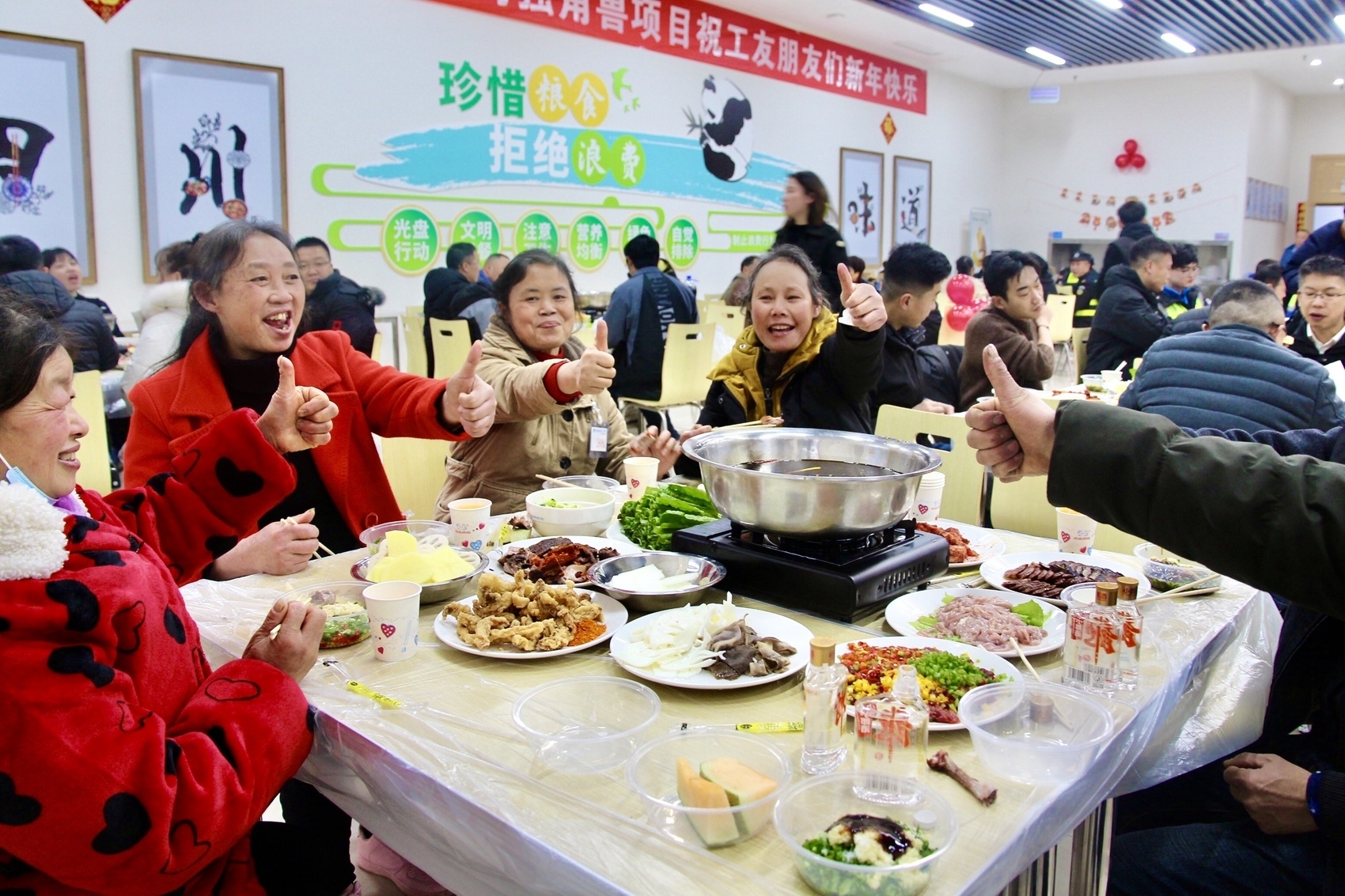 “来来来,我们一起合个影,然后去吃热腾腾的饺子、火锅喽。”手里拿着大礼包,脸上洋溢着幸福的笑容,农民工朋友们和项目管理人员照了一张温馨美满的“全家福”。原来,“爱心集市”之后,该项目工会还为大家准备了一顿丰富、美味的火锅大餐。“走,吃火锅去咯”,张师傅招呼着同行的工友们结伴走向项目职工食堂。