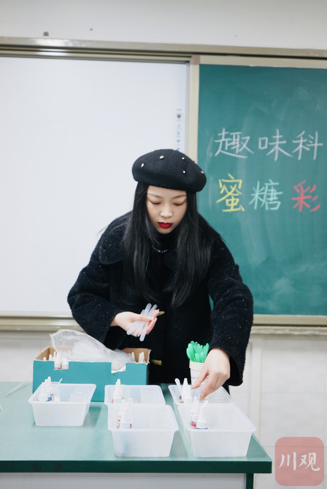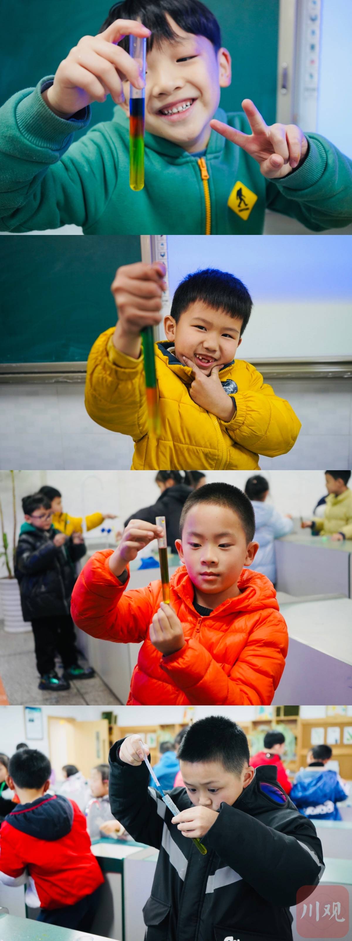 “老师你看,这是彩色的 ! ”1月27日14时30分,成都市石室小学一楼一间教室内,科学老师马桑正引导孩子进行一项名为“蜜糖彩虹塔”的趣味实验,不少孩子各自分配起量杯、量勺、滴管、试管、色素、白砂糖、搅拌棒等器材,不一会儿,孩子们陆续向老师展示起透明试管里的液体分层彩虹。