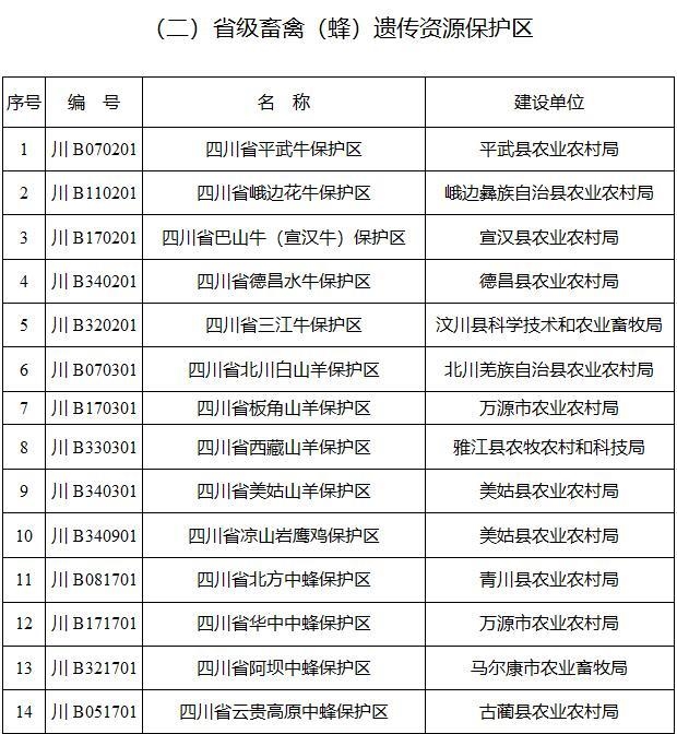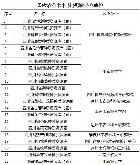 按照农业农村部《关于落实农业种质资源保护主体责任开展农业种质资源登记工作的通知》要求,经自愿申报、市级初审、专家评估、社会公示等环节,农业农村厅确定“四川省水稻种质资源库(圃)”等22家农作物种质资源保护单位、“四川省成华猪保种场”等33家畜禽(蜂)种质资源保护单位、“四川省农业科学院水产研究所”等24家水产种质资源保护单位、“四川省蚕种质资源保种场”等13家蚕桑种质资源保护单位为我省第一批省级农业种质资源保护单位,承担相应种质资源保护主体责任,种质资源保护单位主要负责人由依托单位主要负责人兼职。