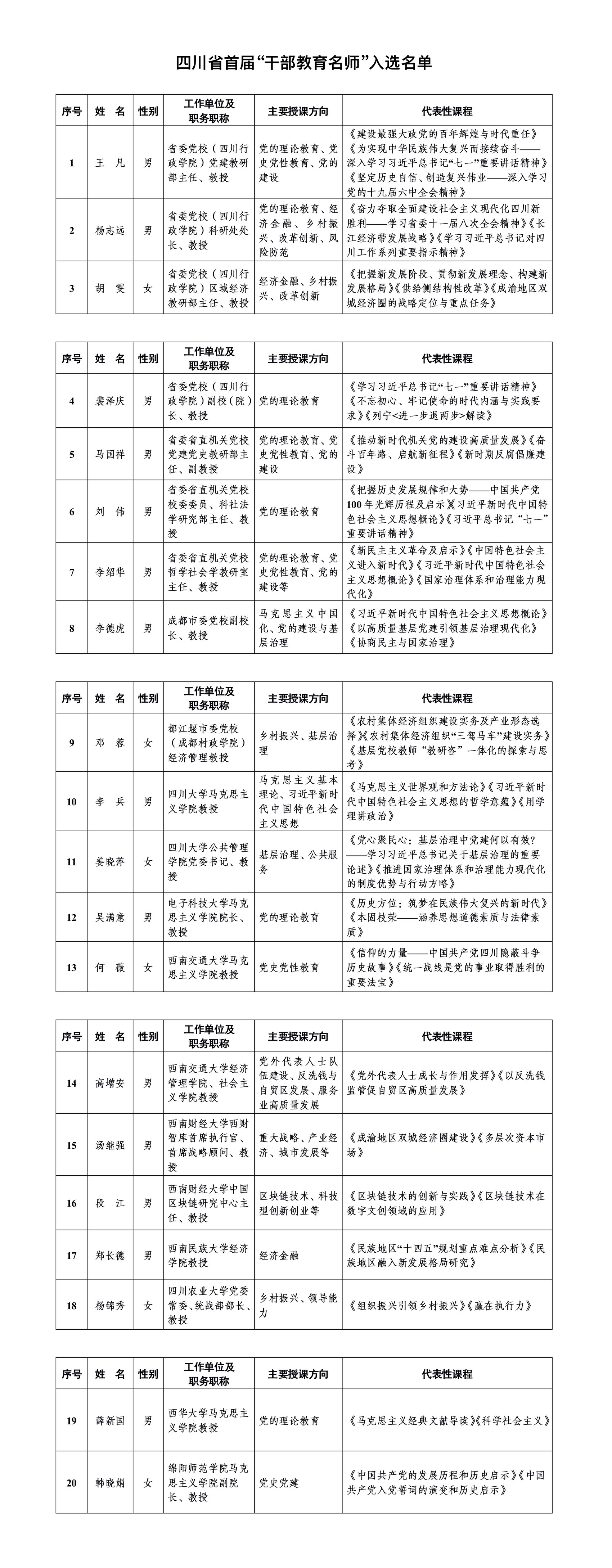 1月29日,四川在线记者从省委组织部获悉,近日,经各地各部门层层推荐、专家评审、社会公示等程序,我省首届“干部教育名师”入选名单正式出炉,20位优秀干部教育名师入选。