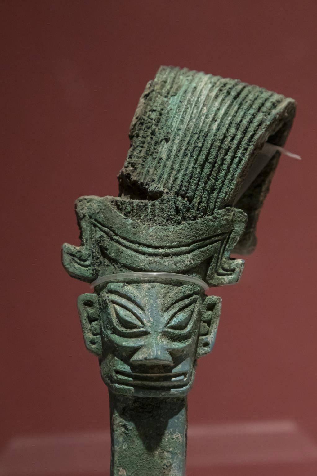 四川博物院“大美亚细亚——亚洲六国文物特展”中展出的三星堆最新出土青铜人像。