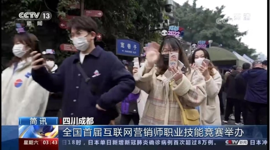 1月29日,CCTV-13新闻直播间播发新闻,关注正在成都举行的全国首届互联网营销师职业技能竞赛总决赛暨2022成都·互联网营销师直播万人拉力赛。据悉,截至1月29日18时,本次大赛累计报名选手超过10万人。