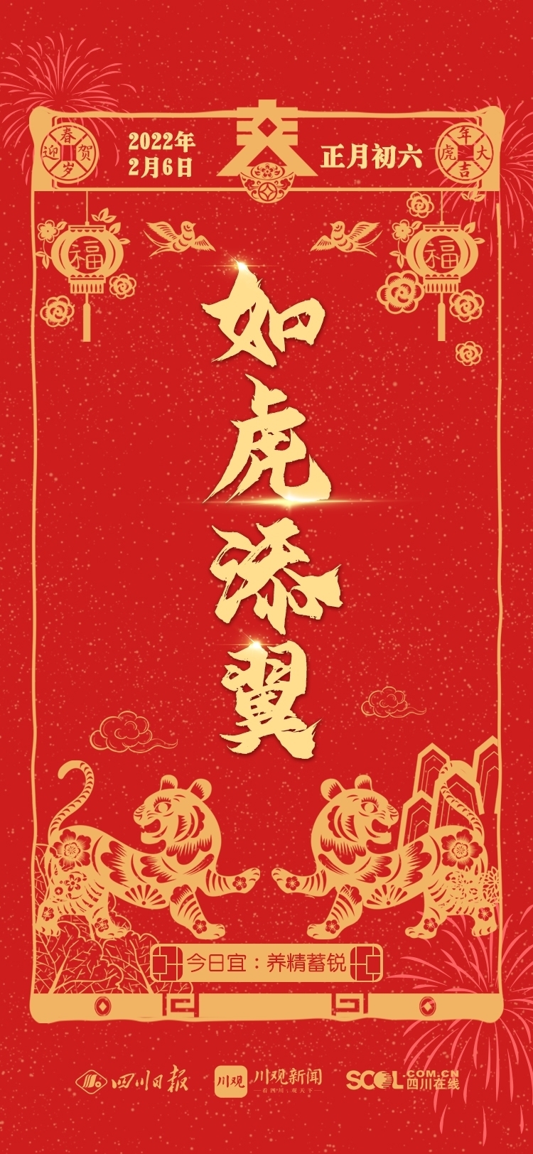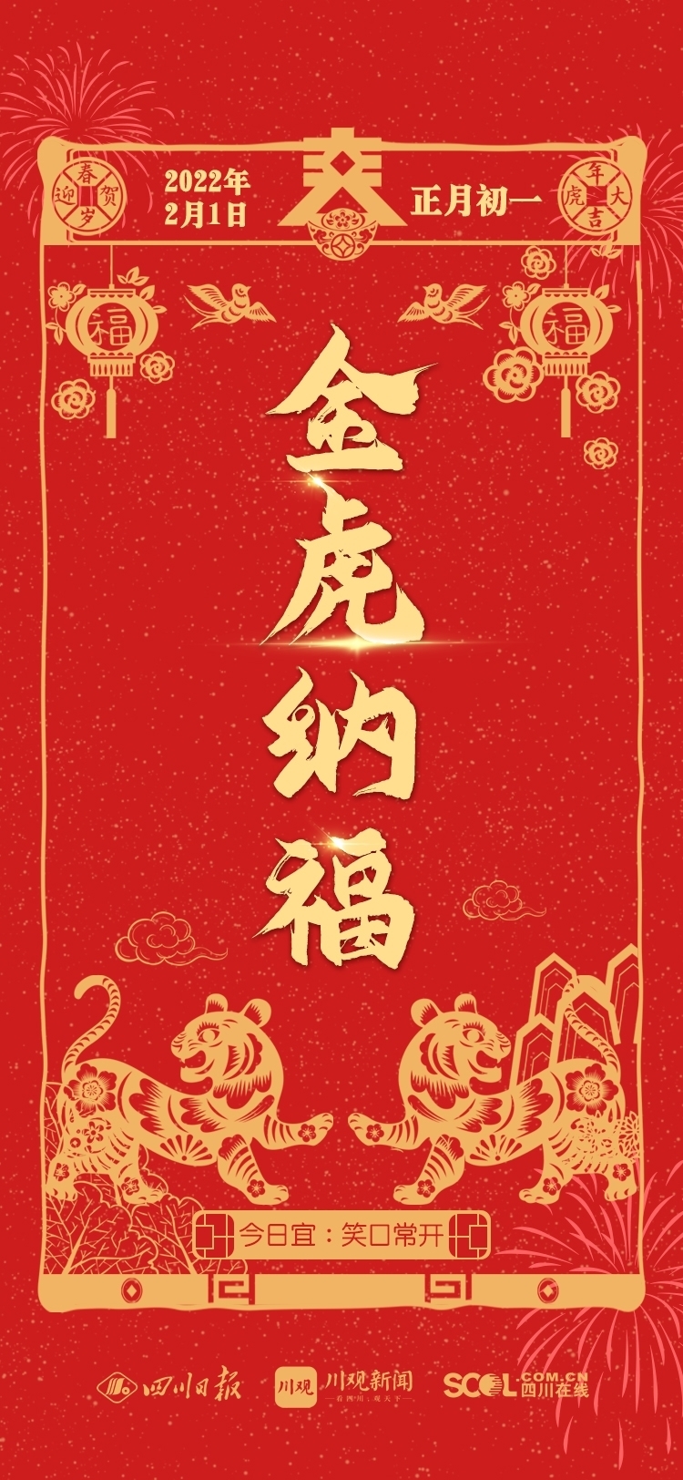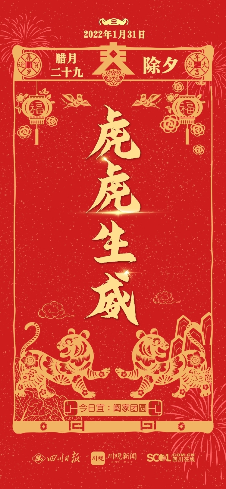 明天就是除夕啦!很快,我们就将迎来壬寅虎年,四川在线送给你一组“红红虎虎”的新春海报,春节七天,每天都有新鲜美好的祝福!祝你虎虎生威、生龙活虎、如虎添翼!