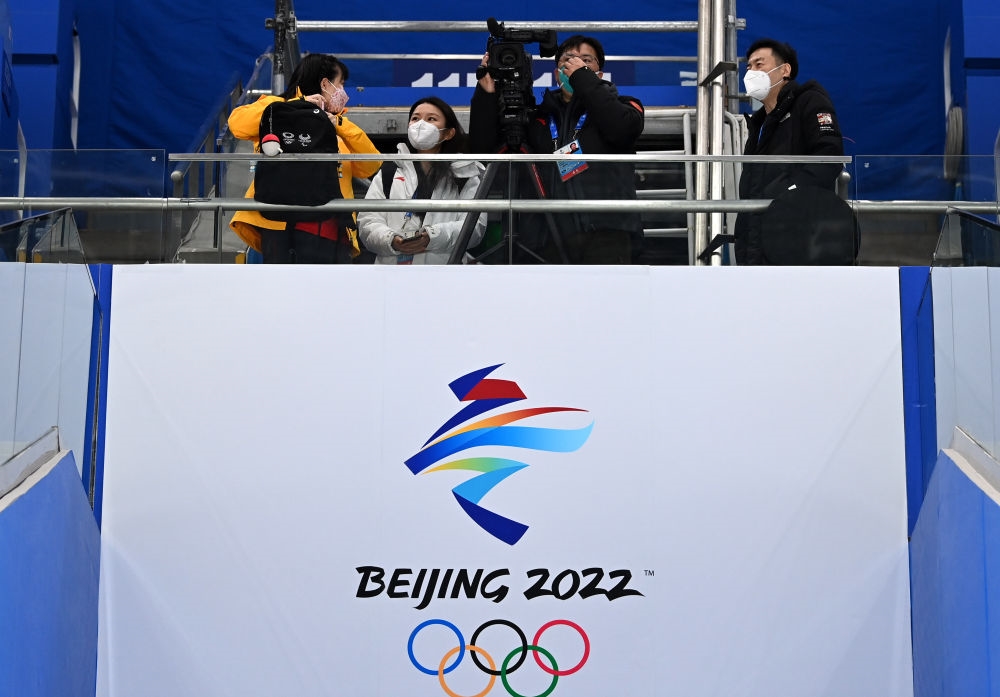 1月28日,记者在国家体育馆进行采访拍摄。新华社记者李紫恒摄