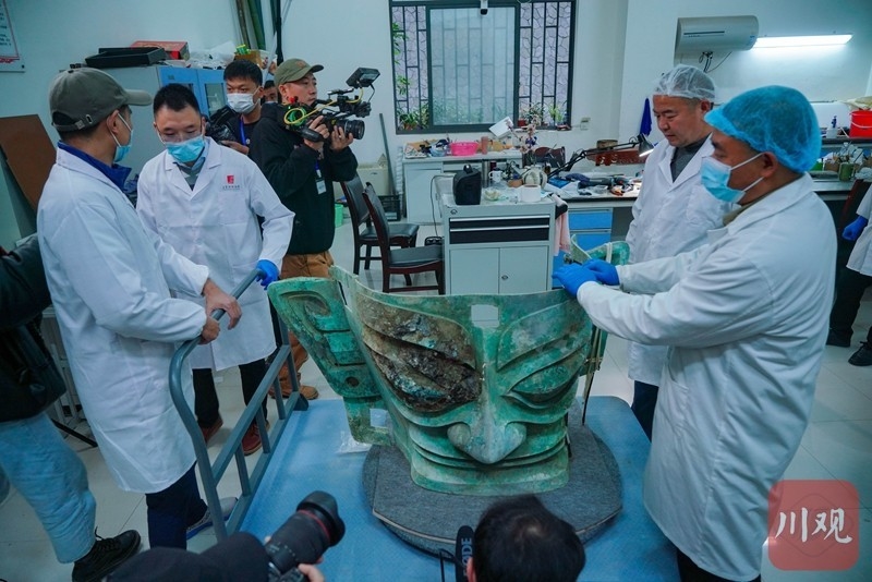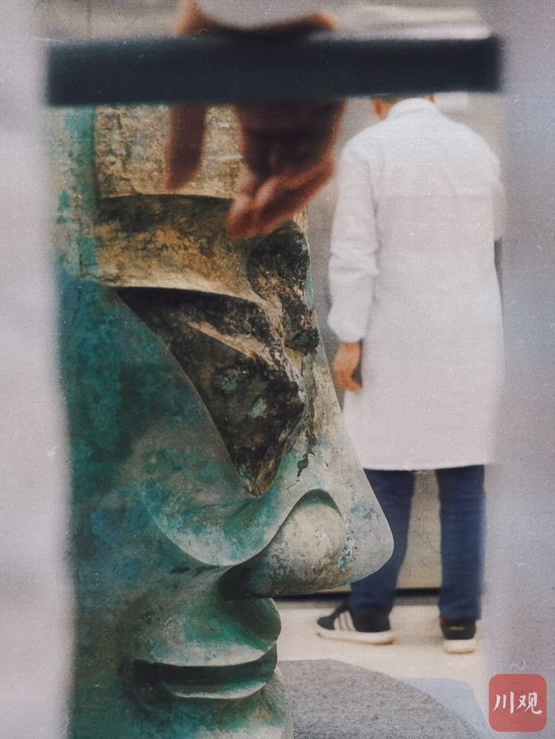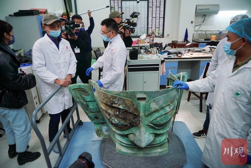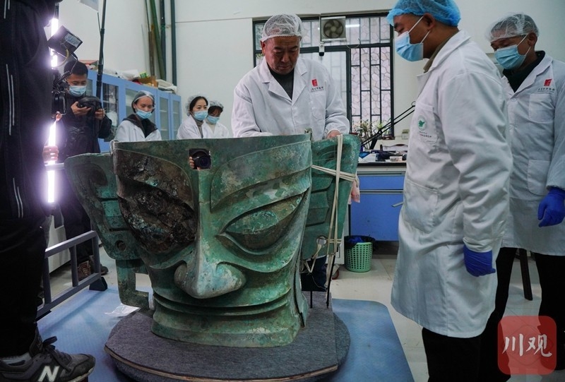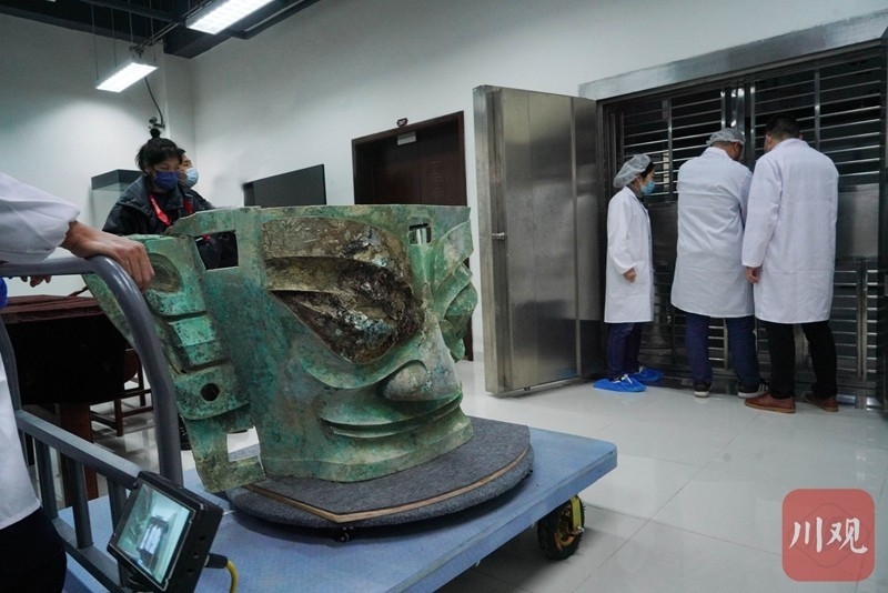 2021年11月26日,三星堆博物馆结束受疫情影响20天的闭馆,恢复开放,记者在采访中“偶遇”文物修复师郭汉中正带领团队为三星堆遗址3号坑出土的青铜大面具加固。在跟拍了半小时后文物修复师打开厚重的文物存放库房大门,护送青铜大面具“回家”。