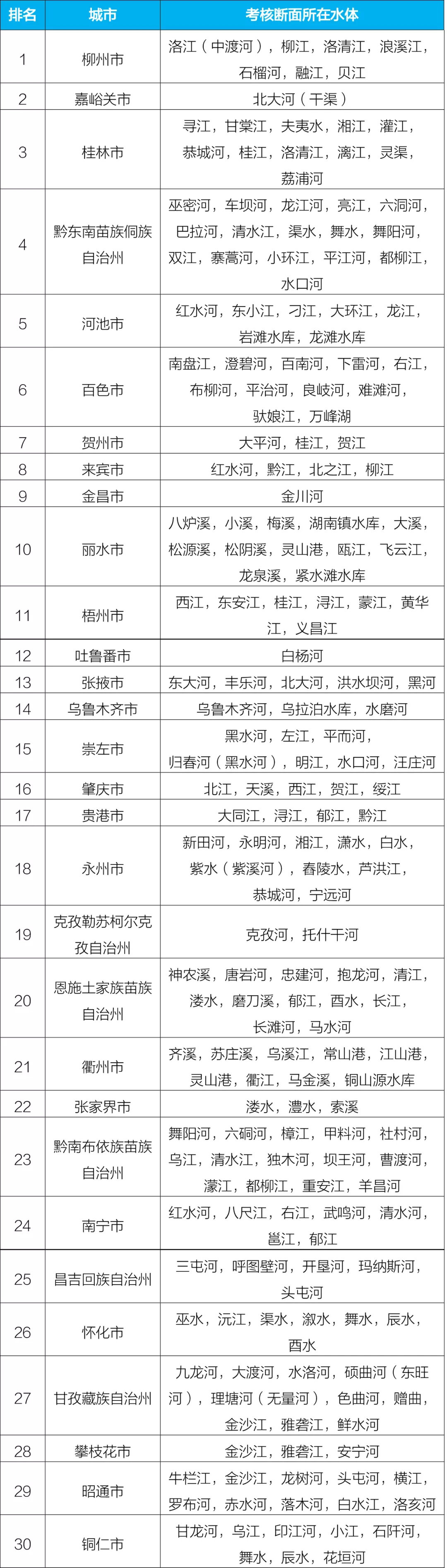 通报显示,2021年1-12月,全国地级及以上城市中,柳州、嘉峪关和桂林等30个城市国家地表水考核断面水环境质量相对较好(从第1名至第30名),临汾、吕梁和商丘等30个城市国家地表水考核断面水环境质量相对较差(从倒数第1名至倒数第30名)。